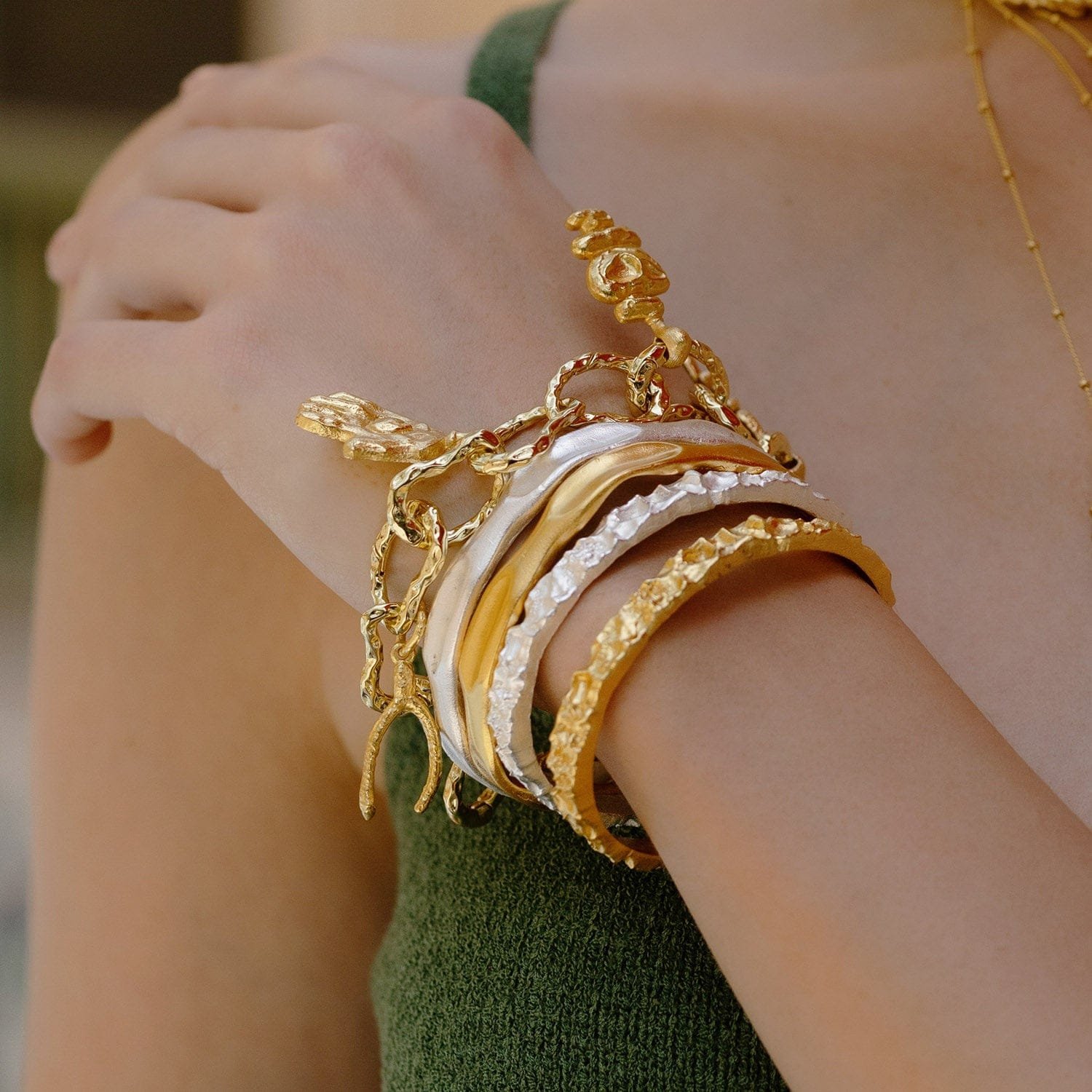 The Detachable Cobbled Charm Bracelet offers a journey through history with its collection of ancient-inspired amulets,