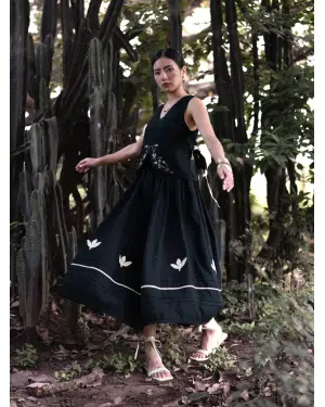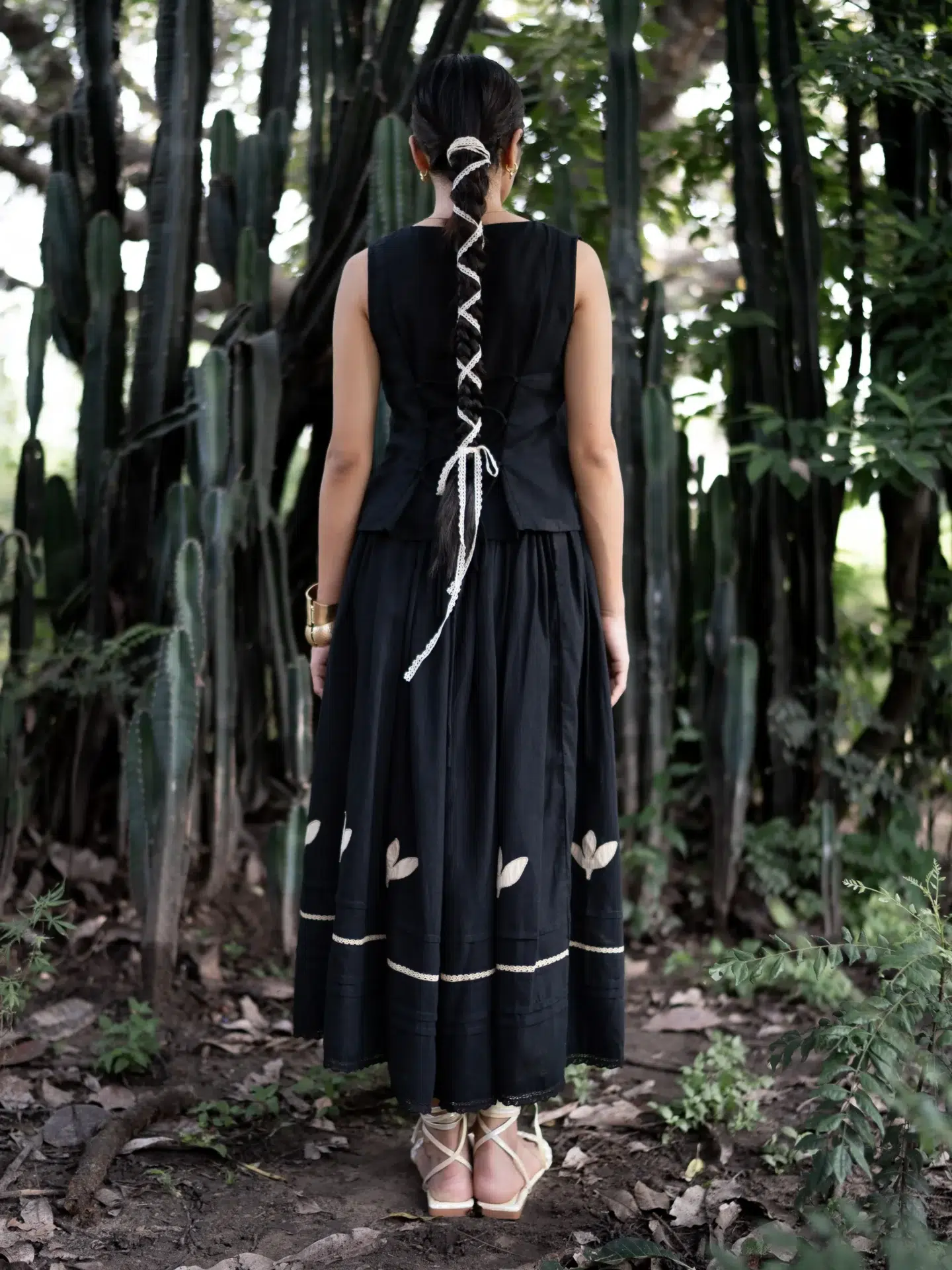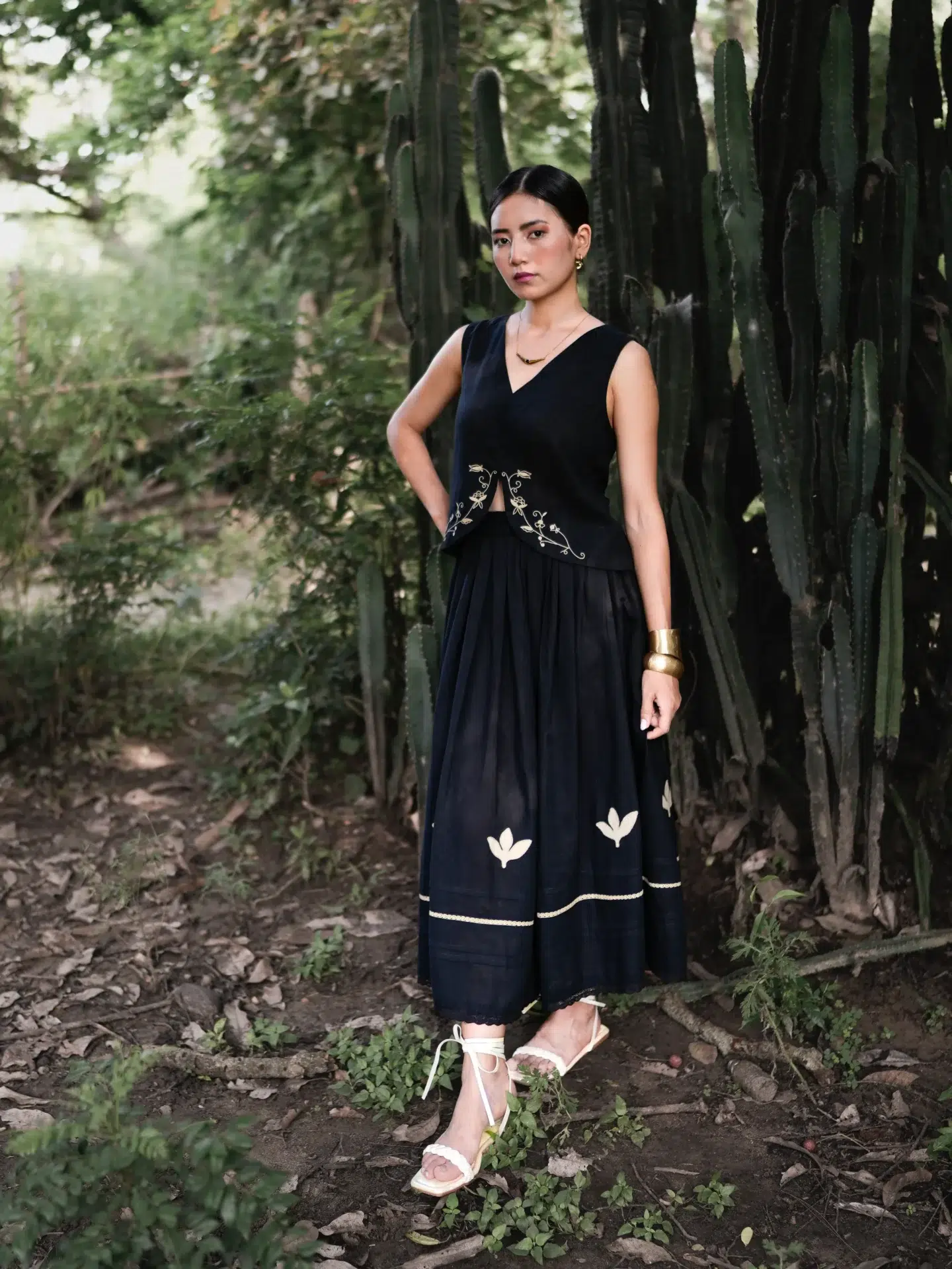 Crafted in breathable linen, this black skirt features intricate appliqué and lace details at the hem. With soft pleats, a comfortable elasticated waist, and a full flared silhouette, it blends artisanal charm with effortless wearability.