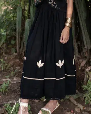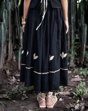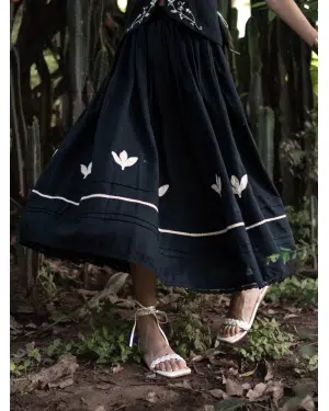 Crafted in breathable linen, this black skirt features intricate appliqué and lace details at the hem. With soft pleats, a comfortable elasticated waist, and a full flared silhouette, it blends artisanal charm with effortless wearability.