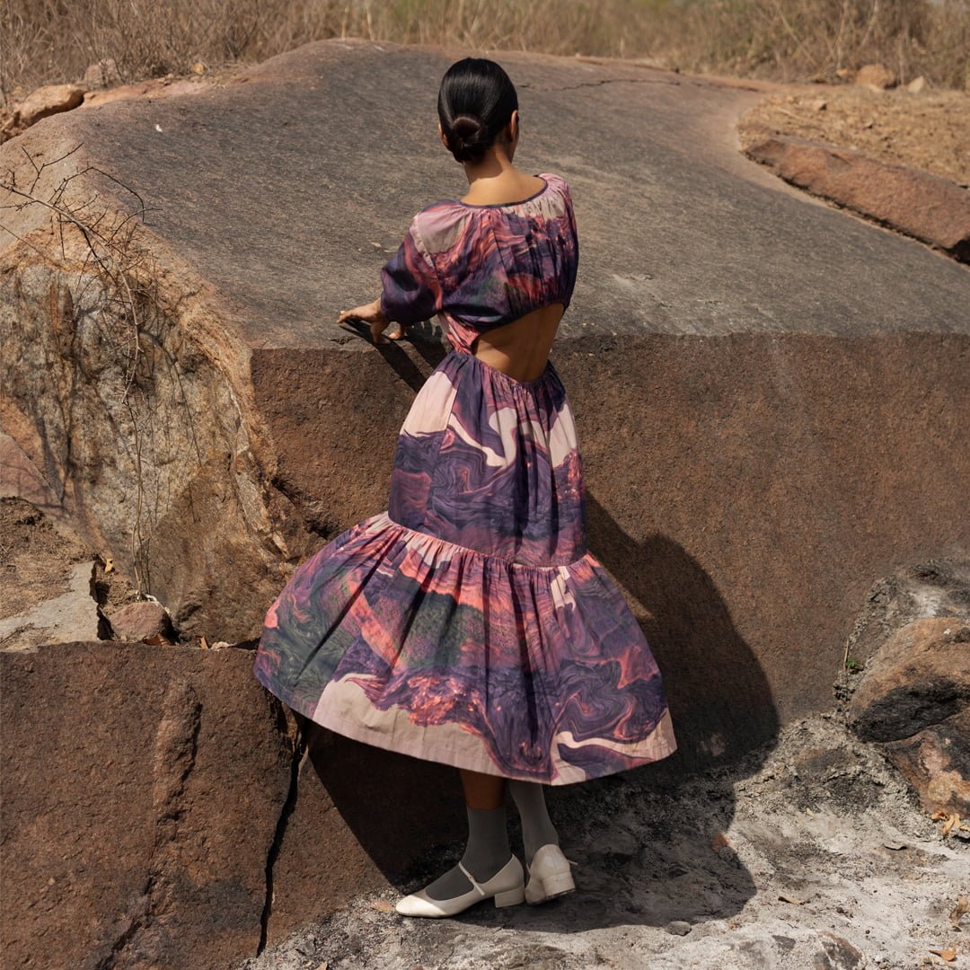 Printed gathered dress with elasticated back and side pocketsFit: RegularFabric: Upcycled cotton (factory deadstock)Leng