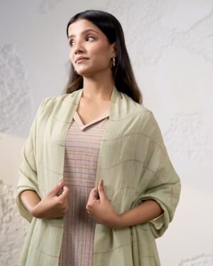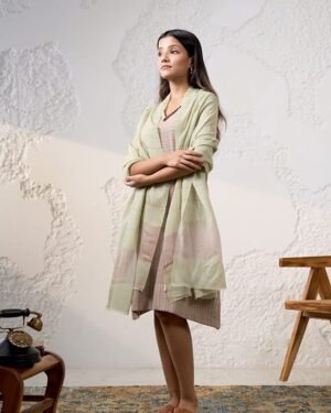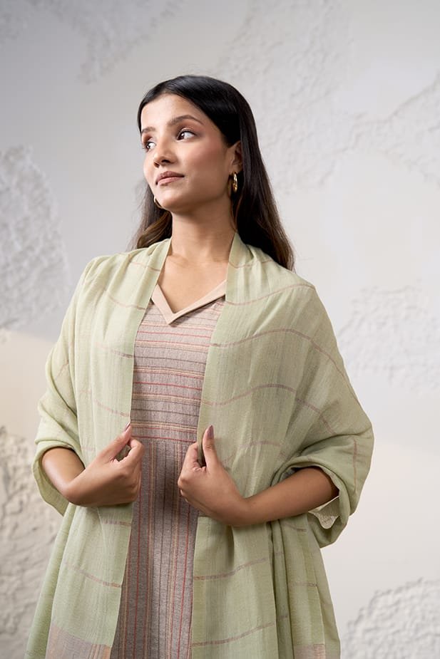 The Aria handwoven stole is made of fine cashmere with a green background and an array of zaree stripes in the front, gi