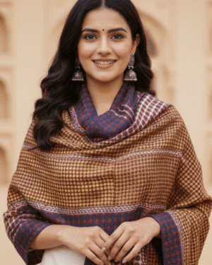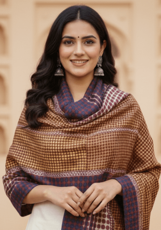 Embrace the warmth of earthy tones with our Amberwood Screen-Printed Cashmere Stole, crafted in 100% Fine Wool Cashmere