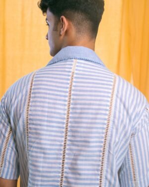 Made from 100% cotton fibres and natural materials. The AY Cuban Collar Shirt is crafted in pastel blue striped handwoven cotton, azo-free dyed, and constructed by playing with the direction of stripes.