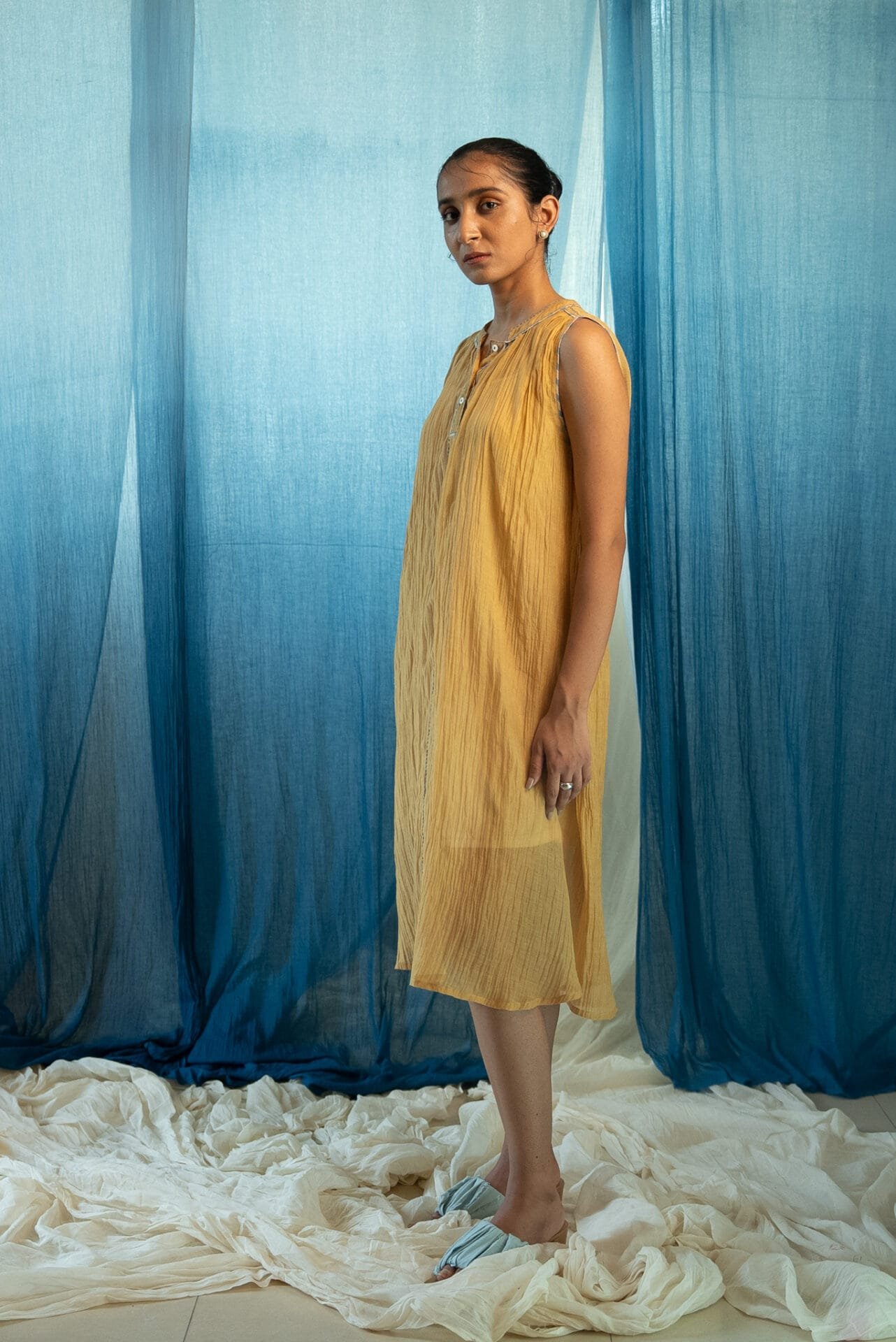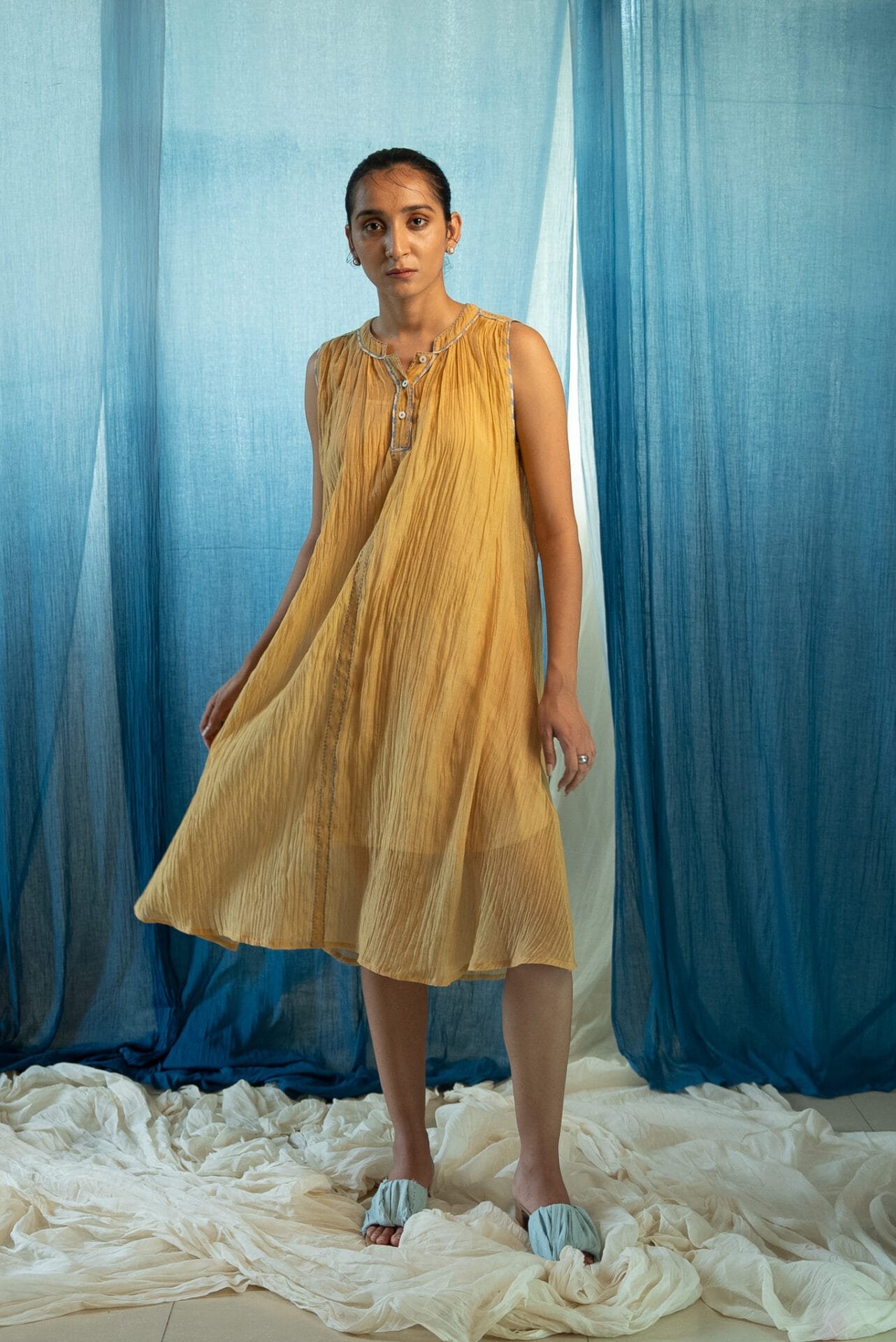 Made from 100% handwoven chanderi and natural materials, this sheer AY Gathered Dress is azo-free dyed in a rich ochre shade. It features contrast piping and is accentuated with subtle hand-done Kantha work.