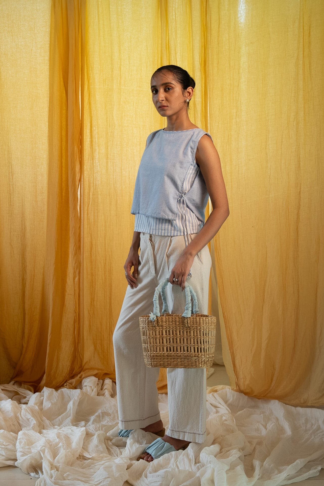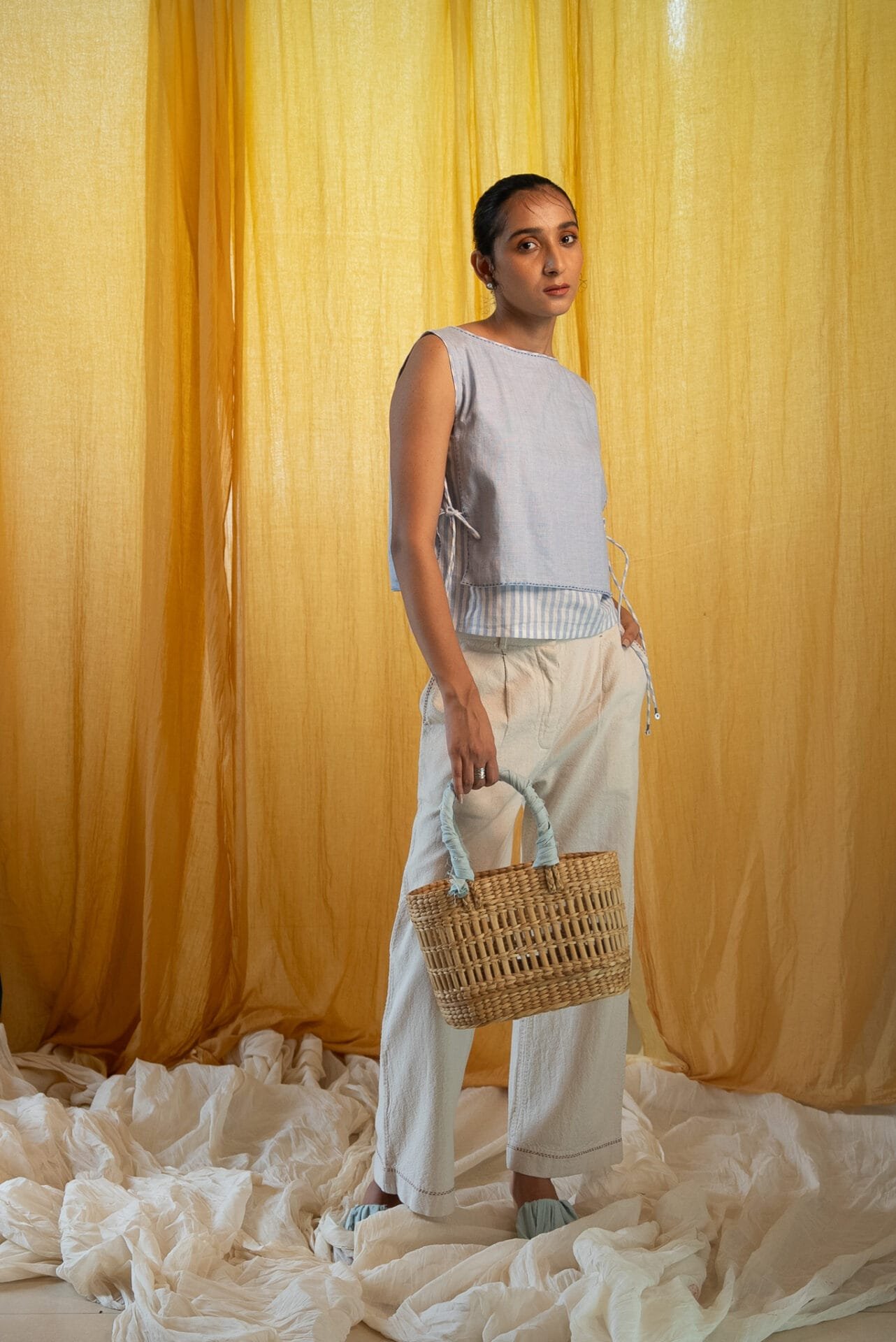 Designed as an everyday staple, it has tie-ups on either side for adjustability and subtle detailing. Easy to wear and layer, the silhouette works across seasons and styles.