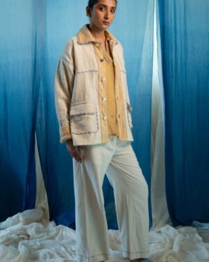 Made from 100% cotton fibres and natural materials, the AY Oversized Shirt Jacket brings together undyed and unbleached zero count handwoven cotton and twill handwoven cotton in a soft yellow shade which is azo-free dyed. The embroidery is minimal, with hand-done Kantha lines running across the surface.