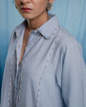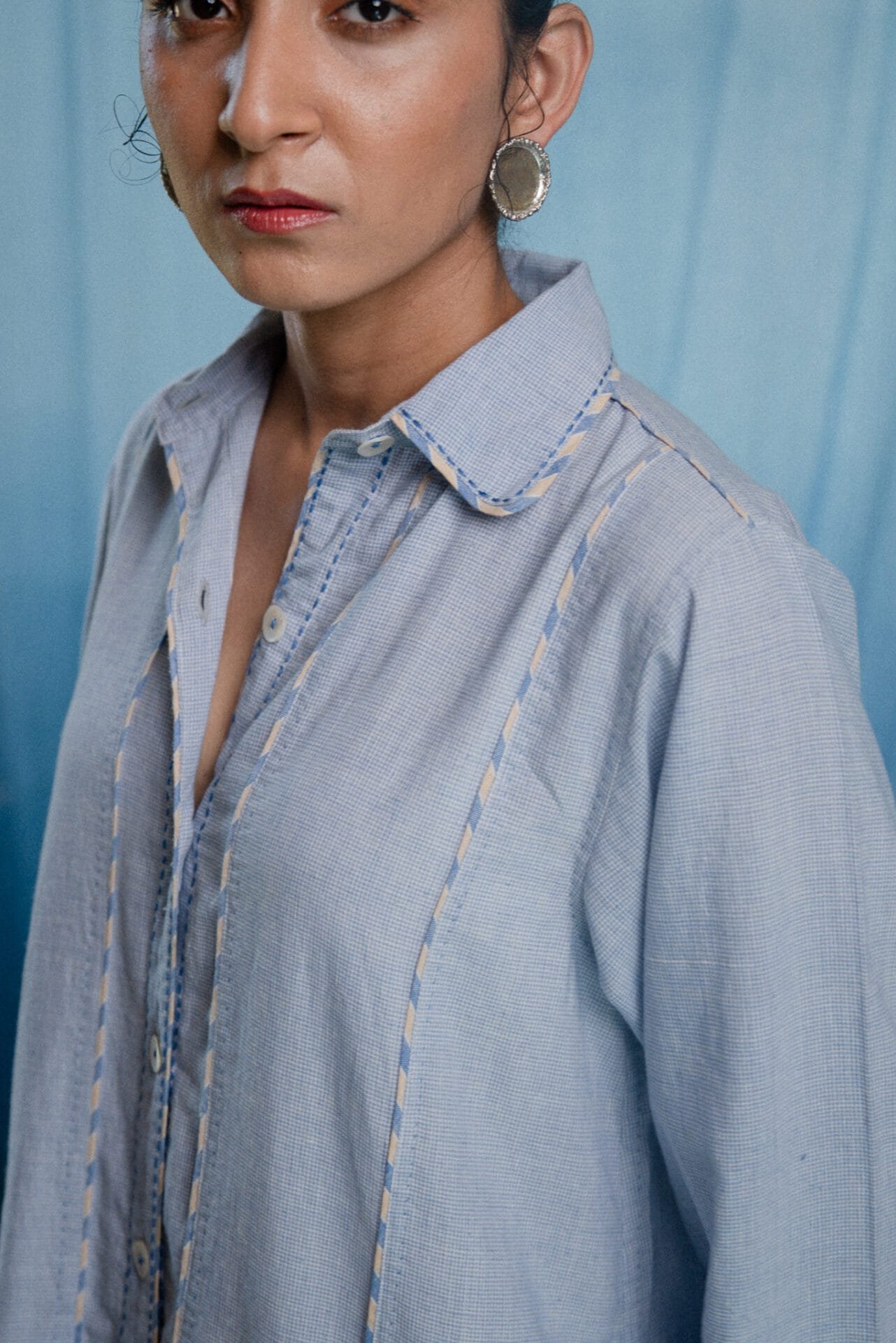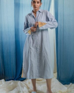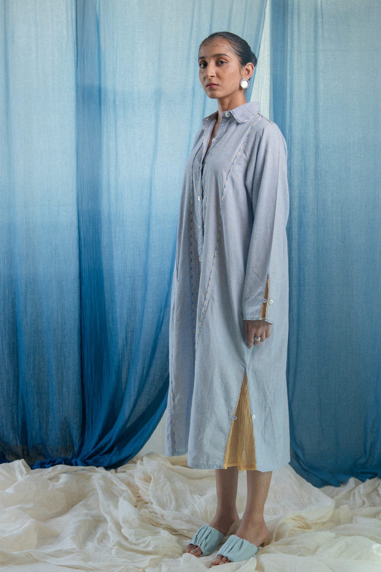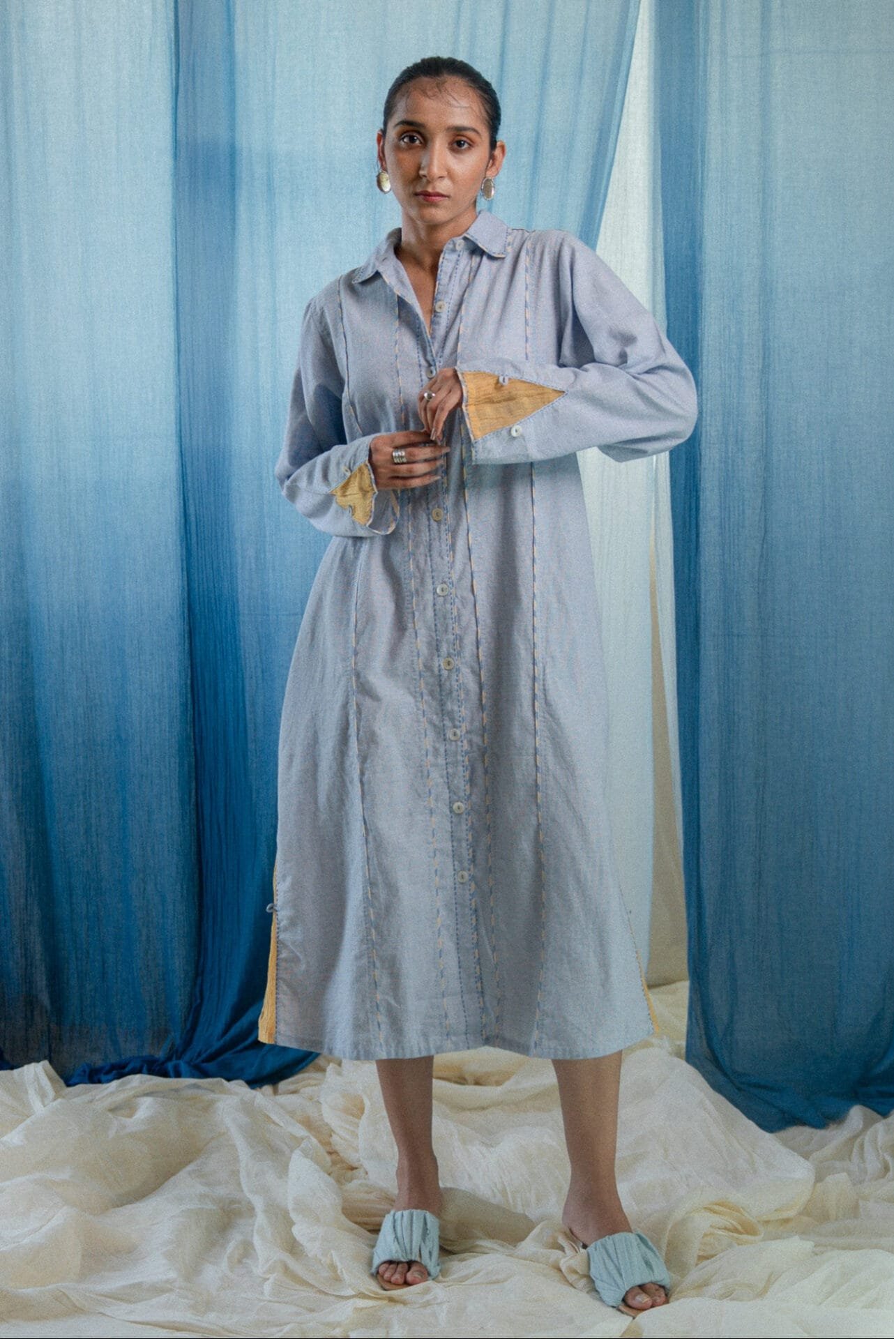 Made from 100% cotton fibres and natural materials, the AY Shirt Dress is made in handwoven check cotton and dyed using azo-free dyes. Striped handwoven cotton piping and hand-done Kantha stitches are used to add subtle detailing throughout the piece.