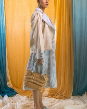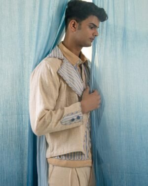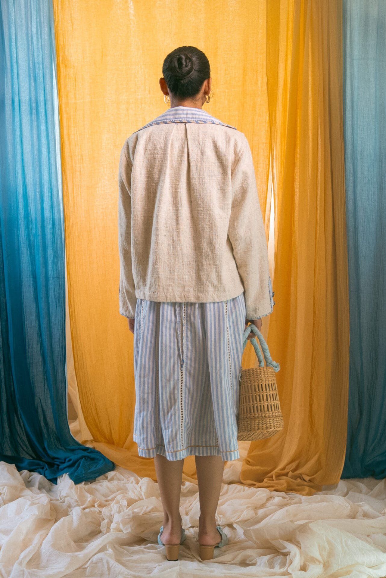 Made from 100% cotton fibres and natural materials. The AY Unisex Cropped Jacket brings together two fabrics- undyed and unbleached zero count handwoven cotton and pastel blue striped handwoven cotton. The embroidery is minimal, with hand-done Kantha lines running across the surface.