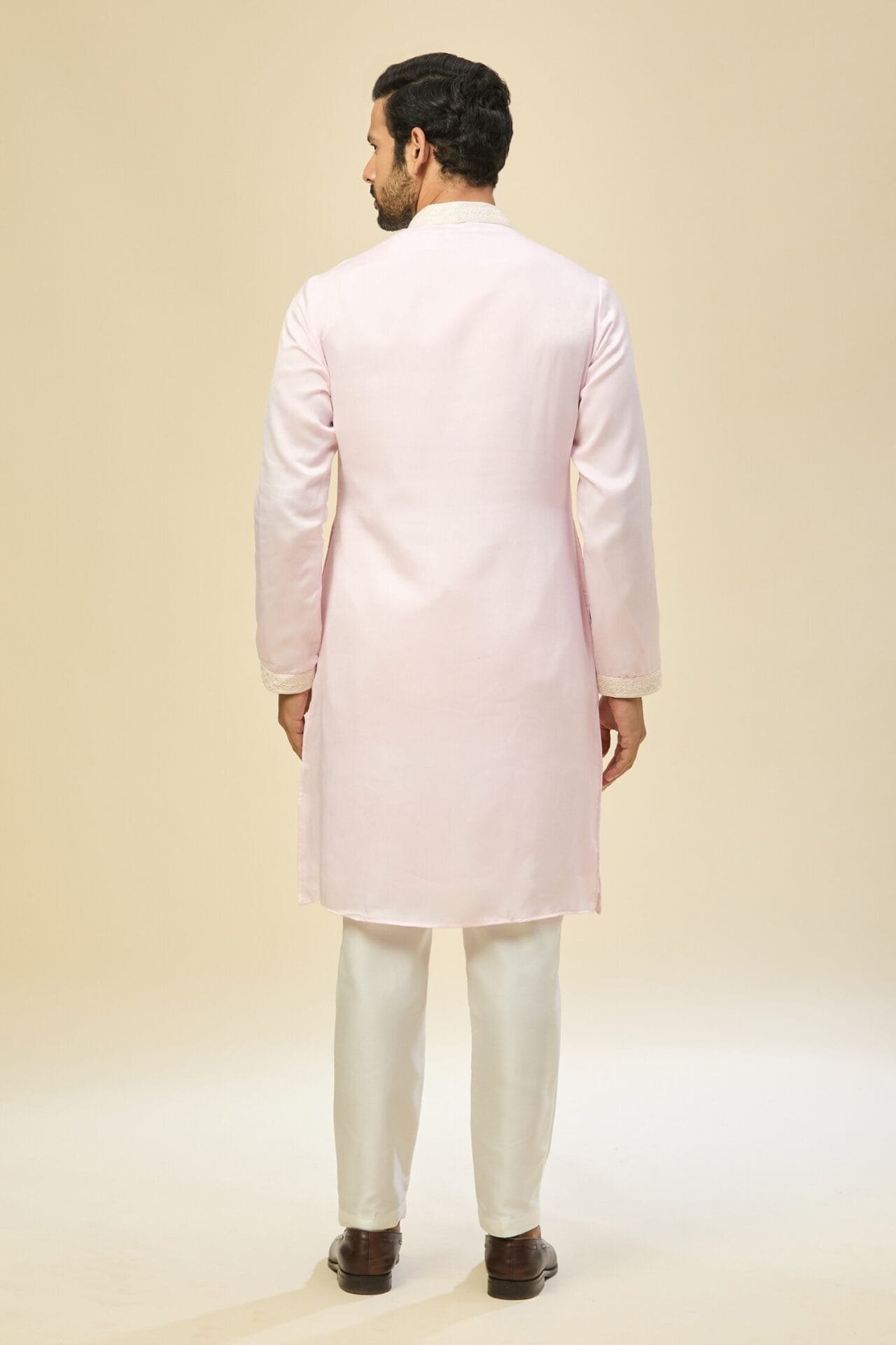 Baby Pink silk based kurta enhanced with white dori and sequins embroidery paired with an off white dupion silk based mexican pants.
