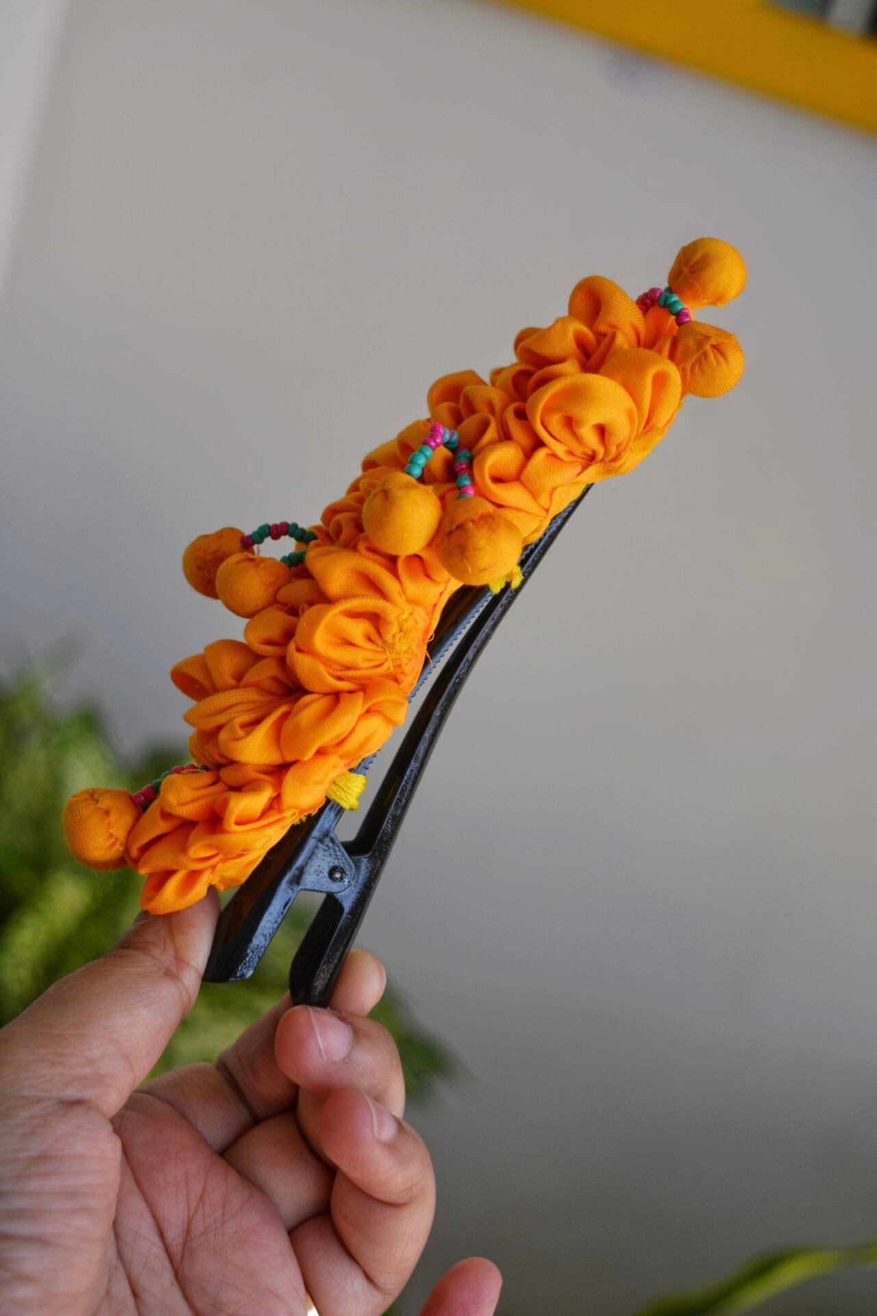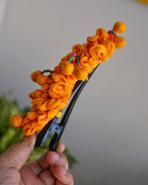 Looking to add a pop of color and a dash of charm to your hairstyle? Let us introduce you to Basanti, the ultimate handmade textile floral claw clip! This beauty is adorned with three dozen bright yellow flowers that are just bursting with life. Imagine a little bouquet right in your hair—it’s as cheerful as it sounds! But wait, there’s more! Nestled among those floral wonders, you’ll find colorful beads peeking out, adding just the right amount of playful sparkle. Whether you’re dressing up for a family gathering or just want to turn heads on a casual day out, one of these statement pieces is all you need to elevate your look. Basanti isn’t just a pretty face; it’s also perfect for special occasions, like a haldi ceremony. Its vibrant hues complement traditional outfits beautifully, making it a go-to accessory for those memorable moments. So, why blend in when you