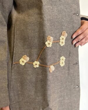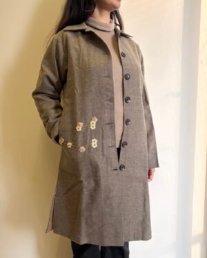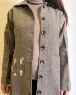 Crafted for cool days and slower moments, this beige woollen jacket brings together warmth, structure, and hand-touched detail. The cotton lining keeps it soft and breathable, while delicate crochet accents add a quiet, crafted charm. Wooden buttons lend an earthy finish, and the straight fit with a 38-inch length gives it a clean, effortless fall.