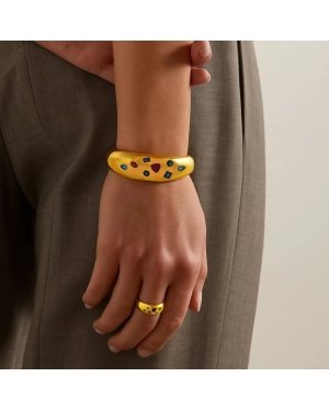 Elevate Your Style with the Bezel Bounty Open BangleIntroducing the Bezel Bounty Open Bangle a timeless accessory designed for women and girls who love a touch of sparkle and sophistication. Featuring a stunning arrangement of multi-colour cubic zirconia stones, this bangle exudes charm and grace. The luxurious 22KT real gold plating on a premium brass alloy base gives it a radiant, high-end finish that catches the light beautifully. Whether you're dressing up for a special event or adding elegance to your everyday look, this bangle is the perfect statement piece.Key Features:Multi-Colour Cubic Zirconia: Vibrant stones create an eye-catching display of colors.22KT Real Gold Plating: Provides a rich, luxurious finish that enhances its beauty and durability.Premium Brass Alloy Construction: Strong and long-lasting, ensuring it retains its shine.Open Design: Adjustable and comfortable fit for a variety of wrist sizes.Perfect for Any Occasion: Whether it's a day at the office, a night out,