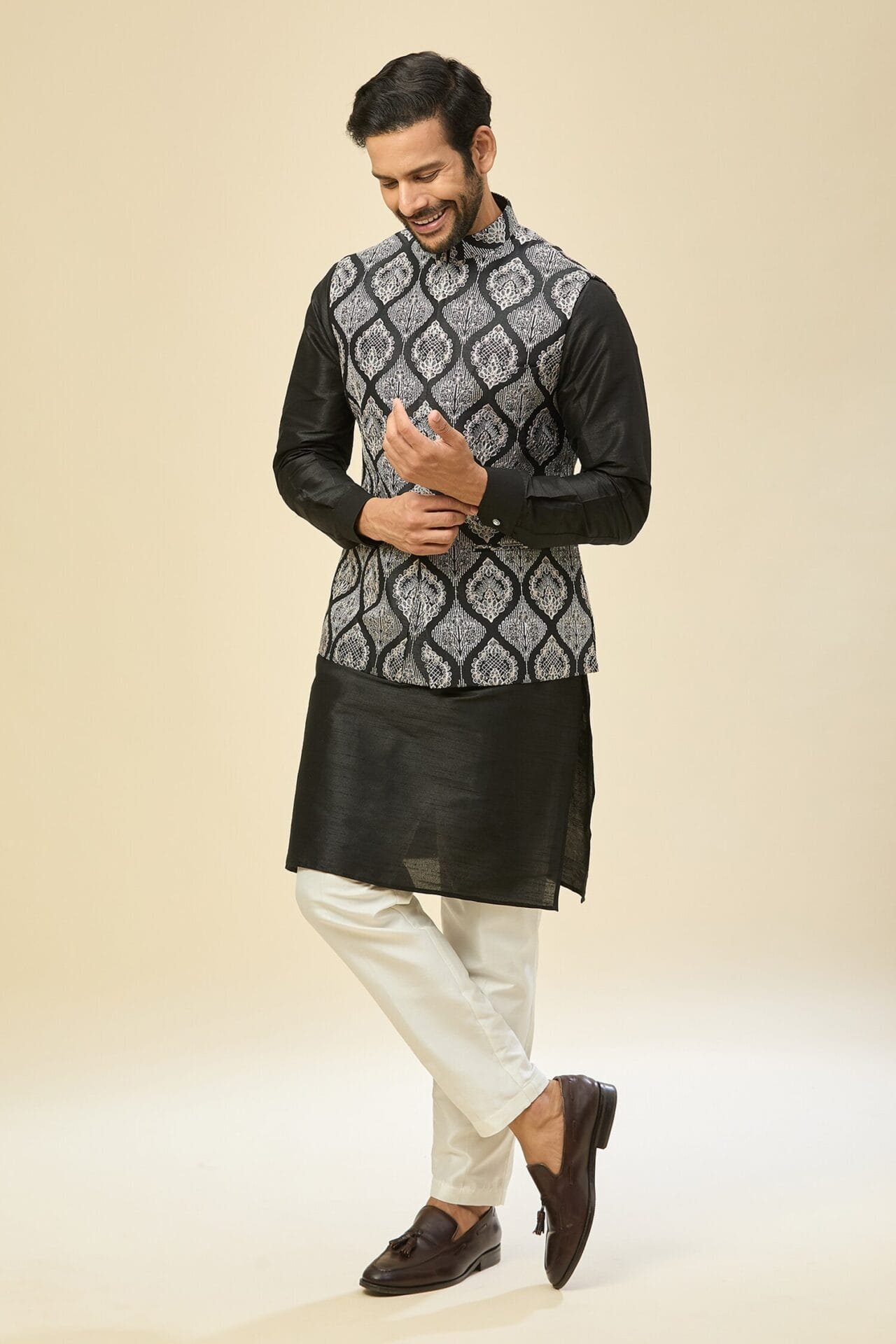Black raw silk based jacket enhanced with thread and sequin embroidery, paired with a matching dupion silk based kurta, and an off white dupion silk based mexican pants.