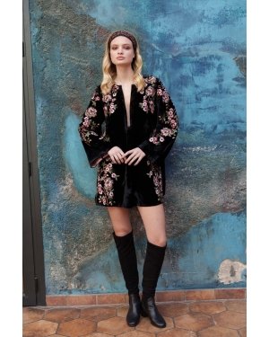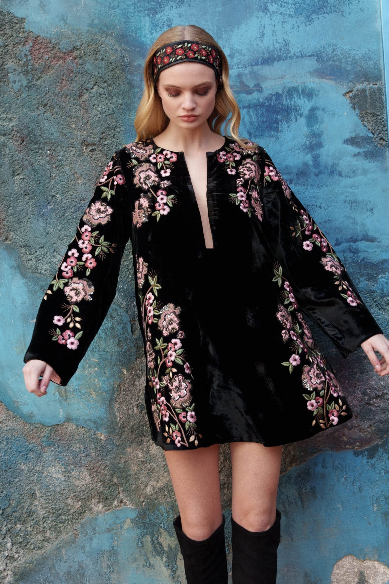Black velvet dress with floral embroidery