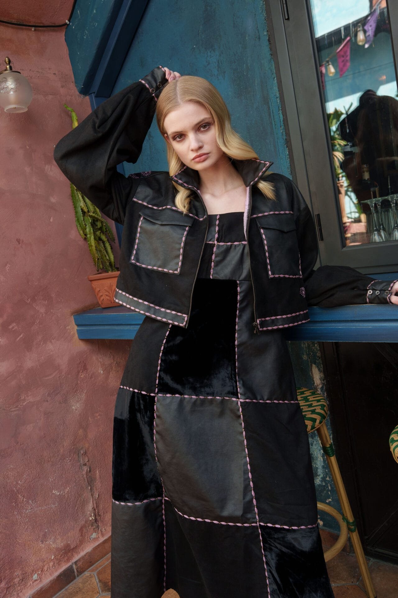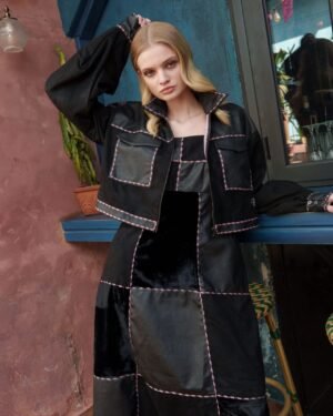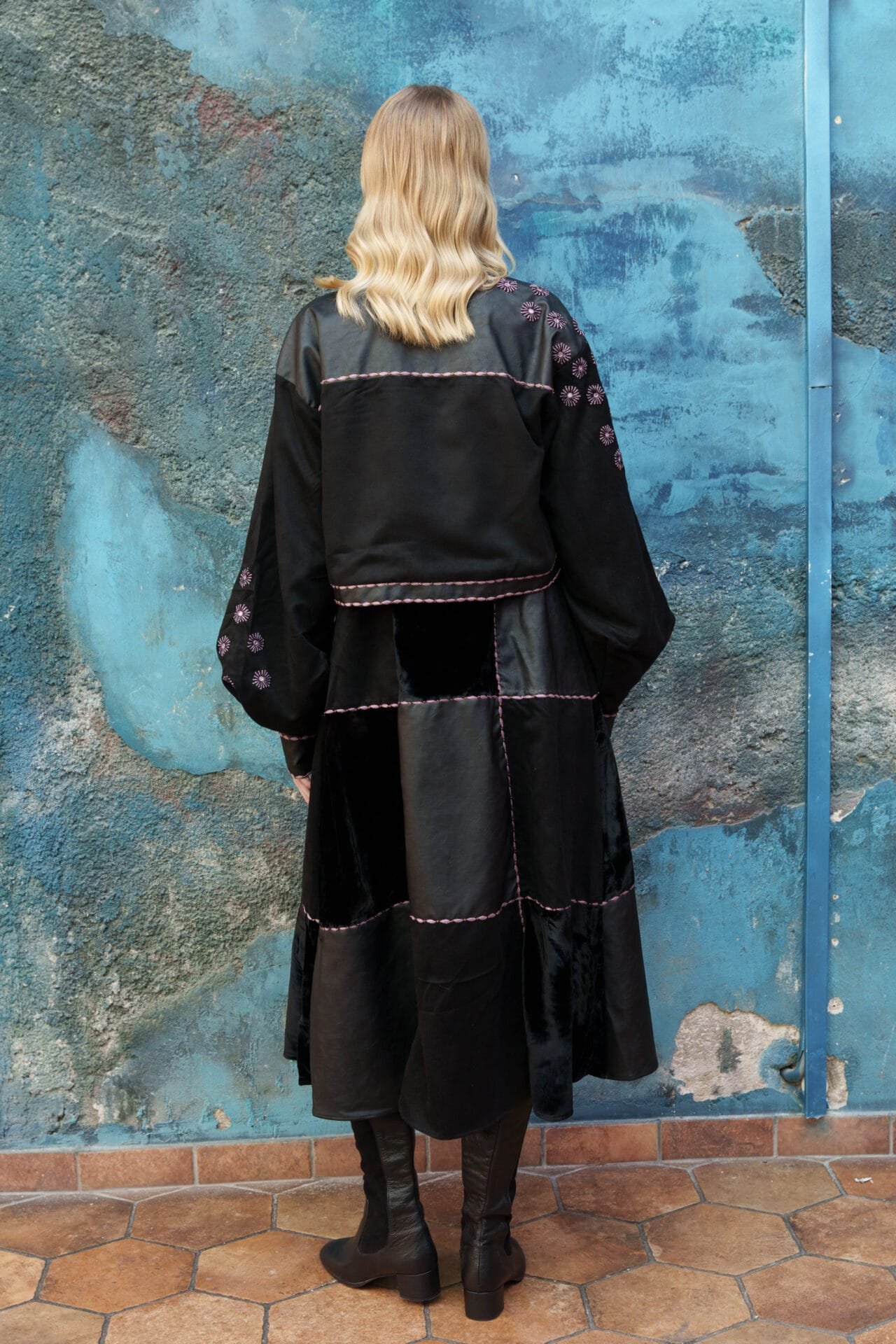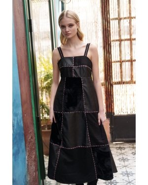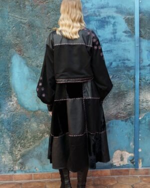 Black velvet, suede and faux leather embroidered dress
