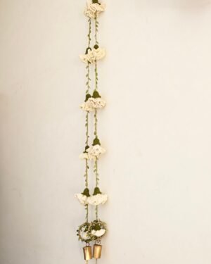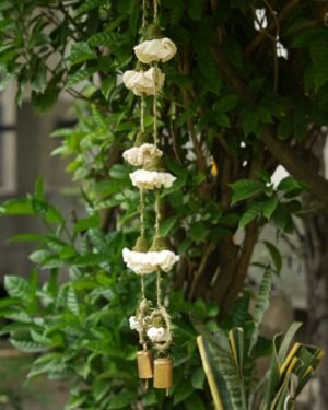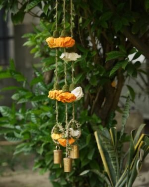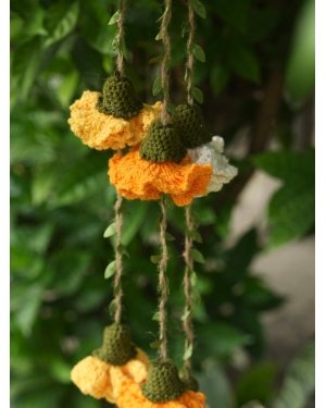 Celebrate the season of lights with handmade beauty that lasts beyond the festivities. This decor hanging brings together crochet marigold flowers on sturdy jute yarn, finished with a brass bell that adds a gentle, traditional chime. A loop at the top makes it easy to hang on doors, walls, or windows, filling your home with festive warmth and charm.
