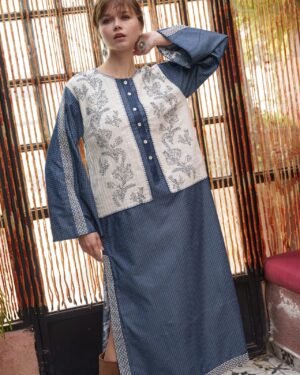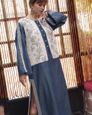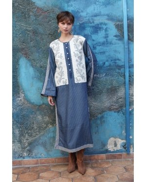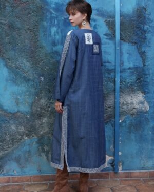 Blue denim kaftan tunic with couching embroidery and co-ord work applique on back