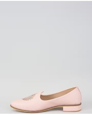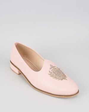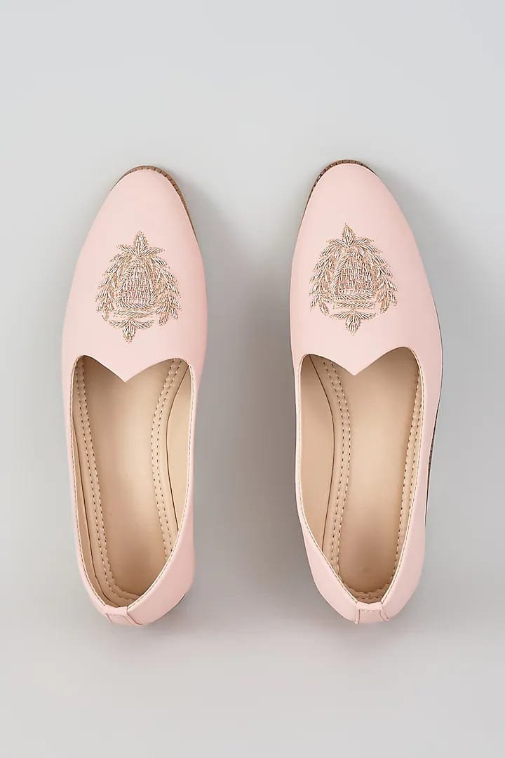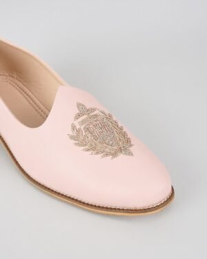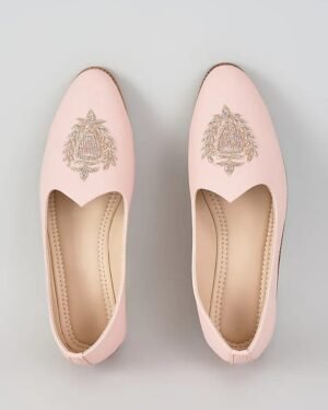 A pair of pink artificial leather based slip on juttis enhanced with zari embroidered royal crest. It has a padded leather lining and a hard sheeted rubber sole.