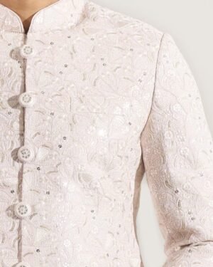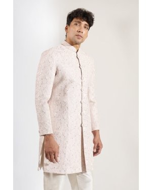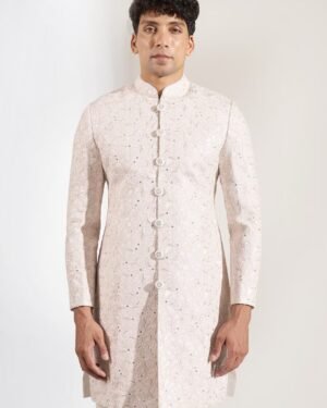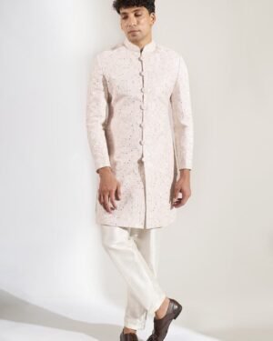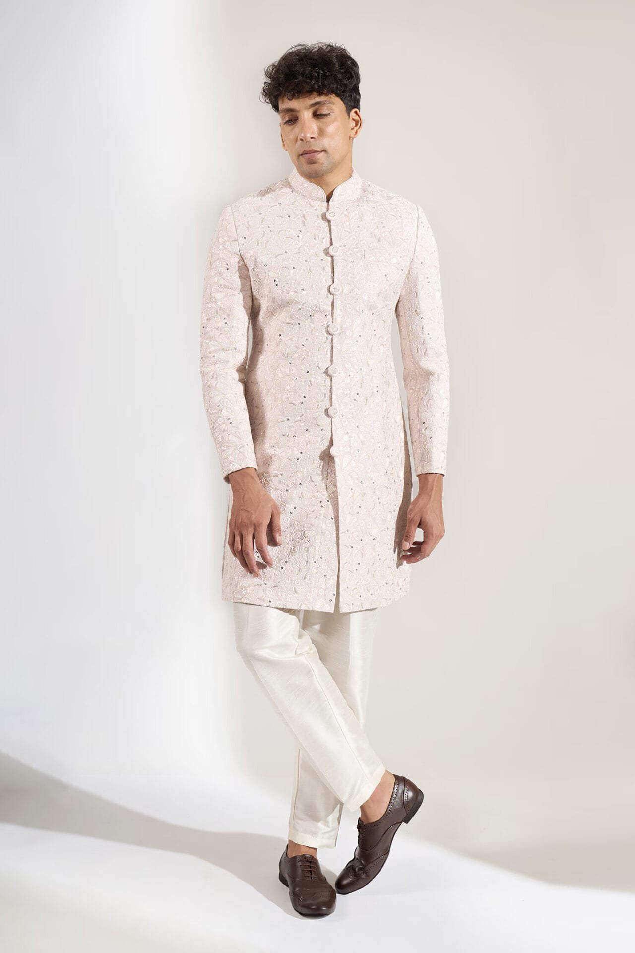 Blush Pink raw silk based achkan with all over resham and sequins embroidery paired with an off white dupion silk based pants.