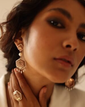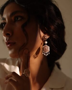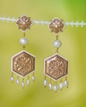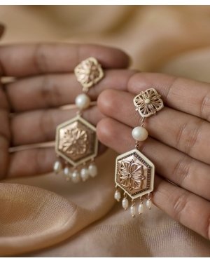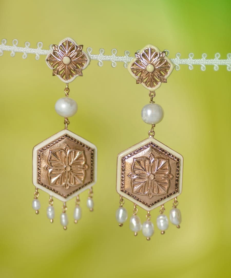 These long earrings are beautifully crafted from 92.5% sterling silver, featuring intricate enameling details and a rose gold plating. Adorned with sparkling zircons along the border and hanging beads, they also feature a pearl at the center, adding length and elegance to the design. The combination of these elements creates a chic, festive touch., Plating: Rosegold Plated, Metal Type: 92.5% Sterling Silver, Enamel / plating / gemstone: Gemstone : Brown zircons, Lock Mechanism: Post and push back, Measurement cm : 6 cm , Measurement inches: 2.36 inch, Care Instruction: Keep away from water, perfume and other liquids. Do not use any cleaning agents. Clean when storing in the provided pouches. Store them in moisture free areas and keep them away from water and liquid fragrances.