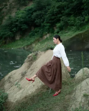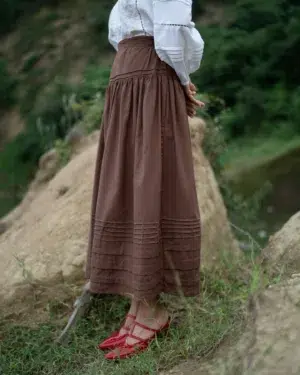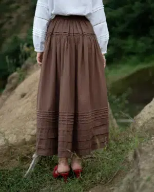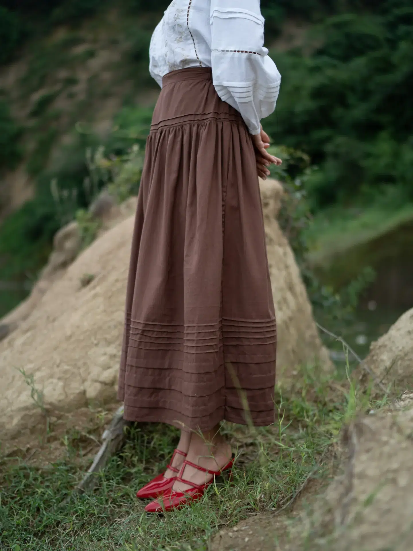 In rich mocha brown cotton, this flared skirt features a clean front band with a comfortable back elasticated fit. Designed with practical pockets, delicate pleat and lace detailing, and a full-circle cut, it offers both charm and graceful movement.
