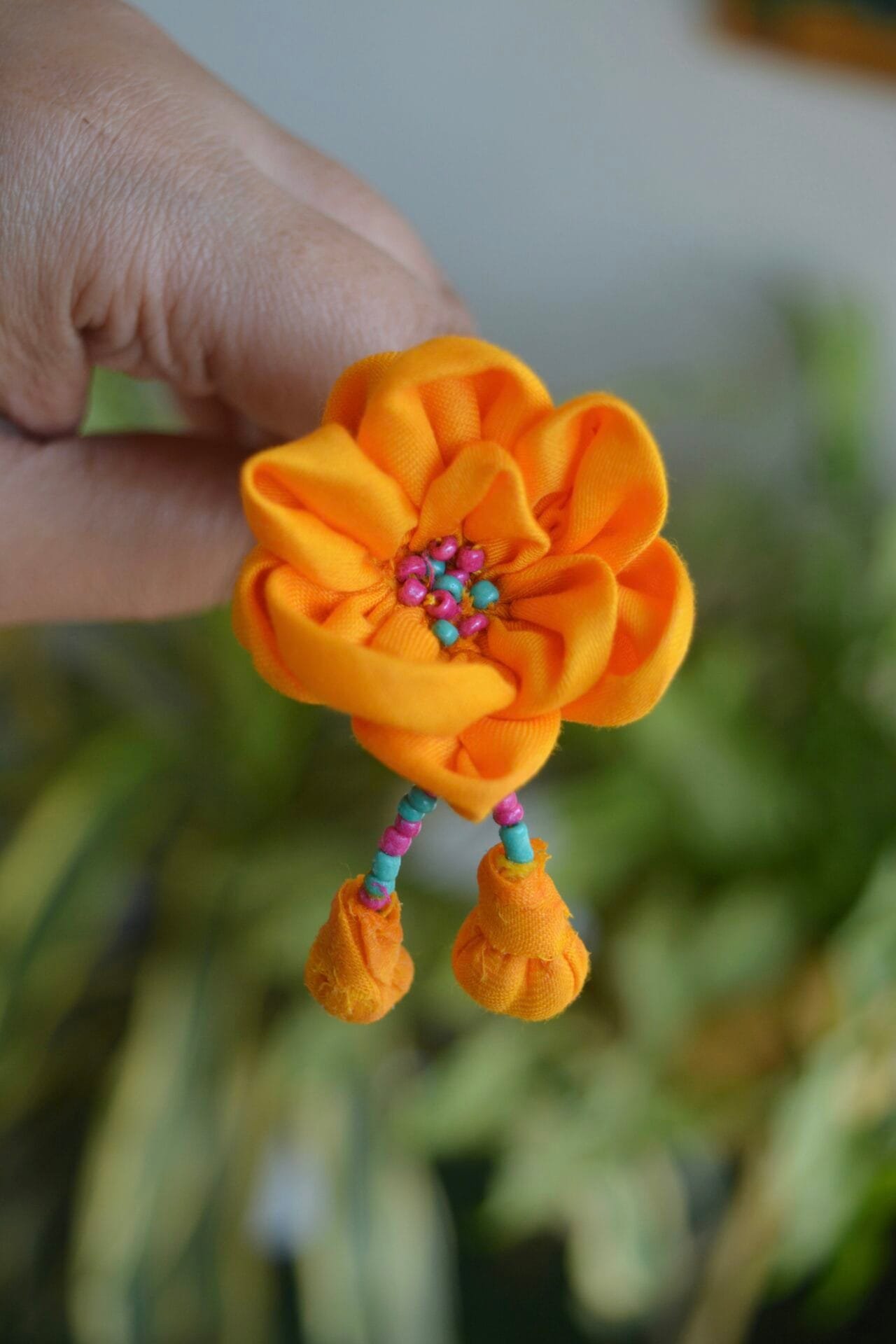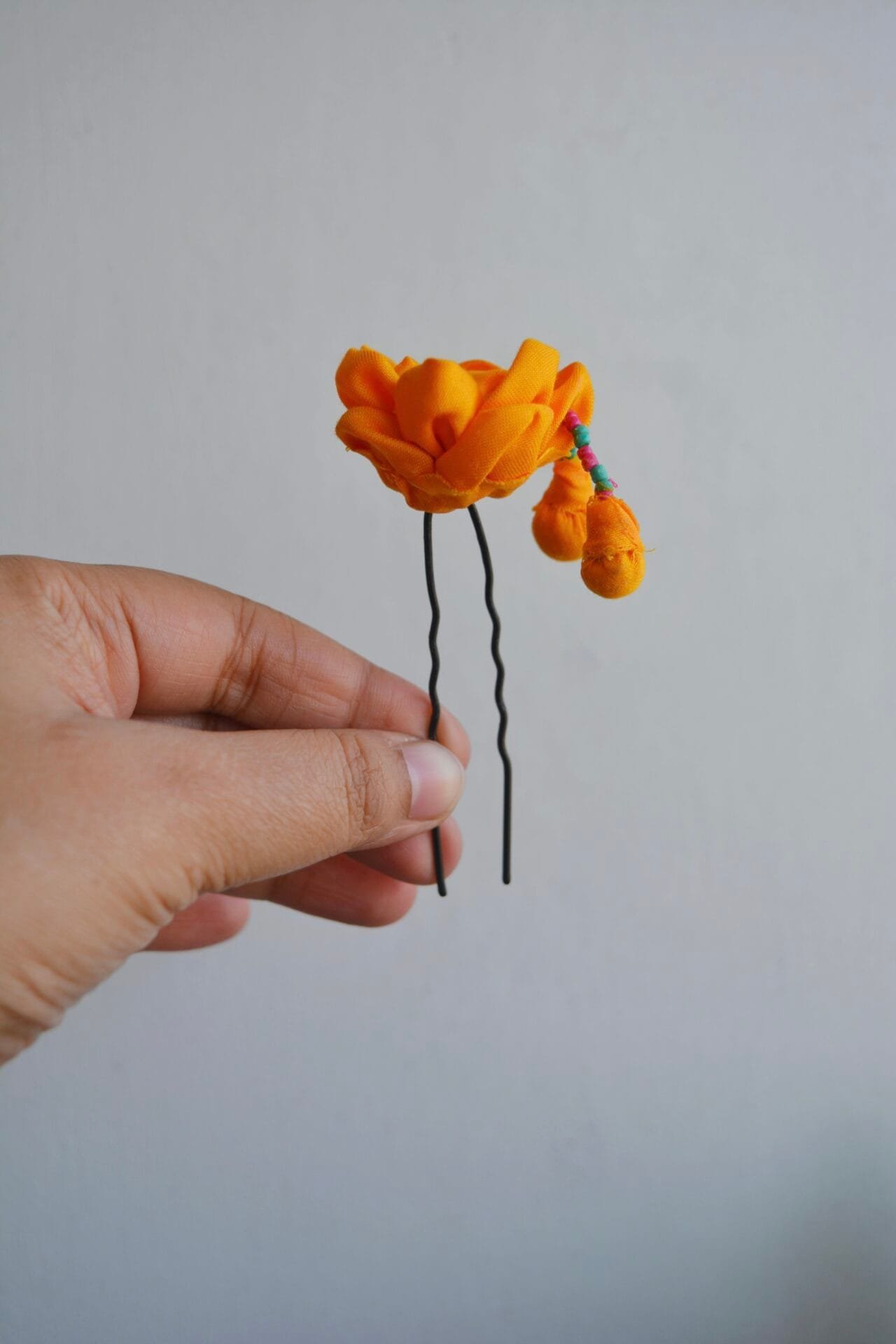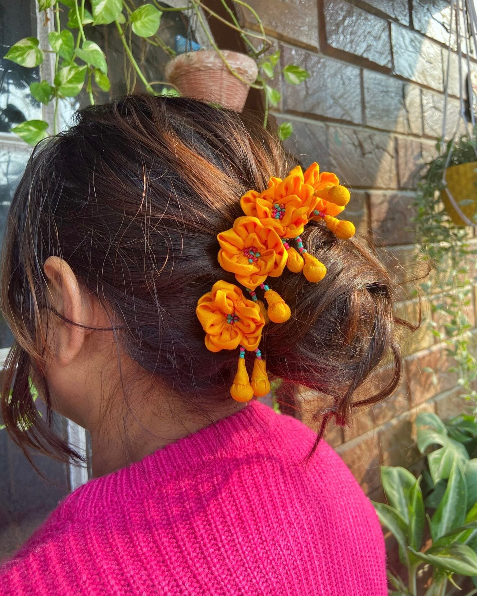 Brighten up your hairstyle with our one-of-a-kind handmade textile flower pin, Champa ! Crafted with love, this charming accessory features a vibrant sunshine-yellow fabric that is sure to catch everyone’s eye. At the heart of the flower, a pop of colorful beads adds a playful touch, making it a perfect statement piece for any occasion.Whether you’re rocking a sleek bun or letting your hair flow loose, this flower pin effortlessly elevates your look. It’s especially lovely for those festive haldi ceremonies, where you want to shine a little brighter! Lightweight and comfortable, you can wear it all day without a worry.Embrace the beauty of uniqueness with this floral hairpin that says, “I’m here to steal the show!” Trust us, it’s not just an accessory; it’s a mood booster! Get ready to turn heads and spread sunshine wherever you go.Wash Care: Spot clean the product with a soft brush and mild