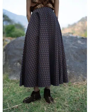 Featuring an abstract checks print, this skirt brings a bold graphic charm to a classic silhouette. The clean waistband keeps the look sleek and structured, it has a side zip opening for a flexible fit that moves effortlessly with you. The flare adds fluidity to every step—making it a perfect choice for both casual and dressed-up edits.