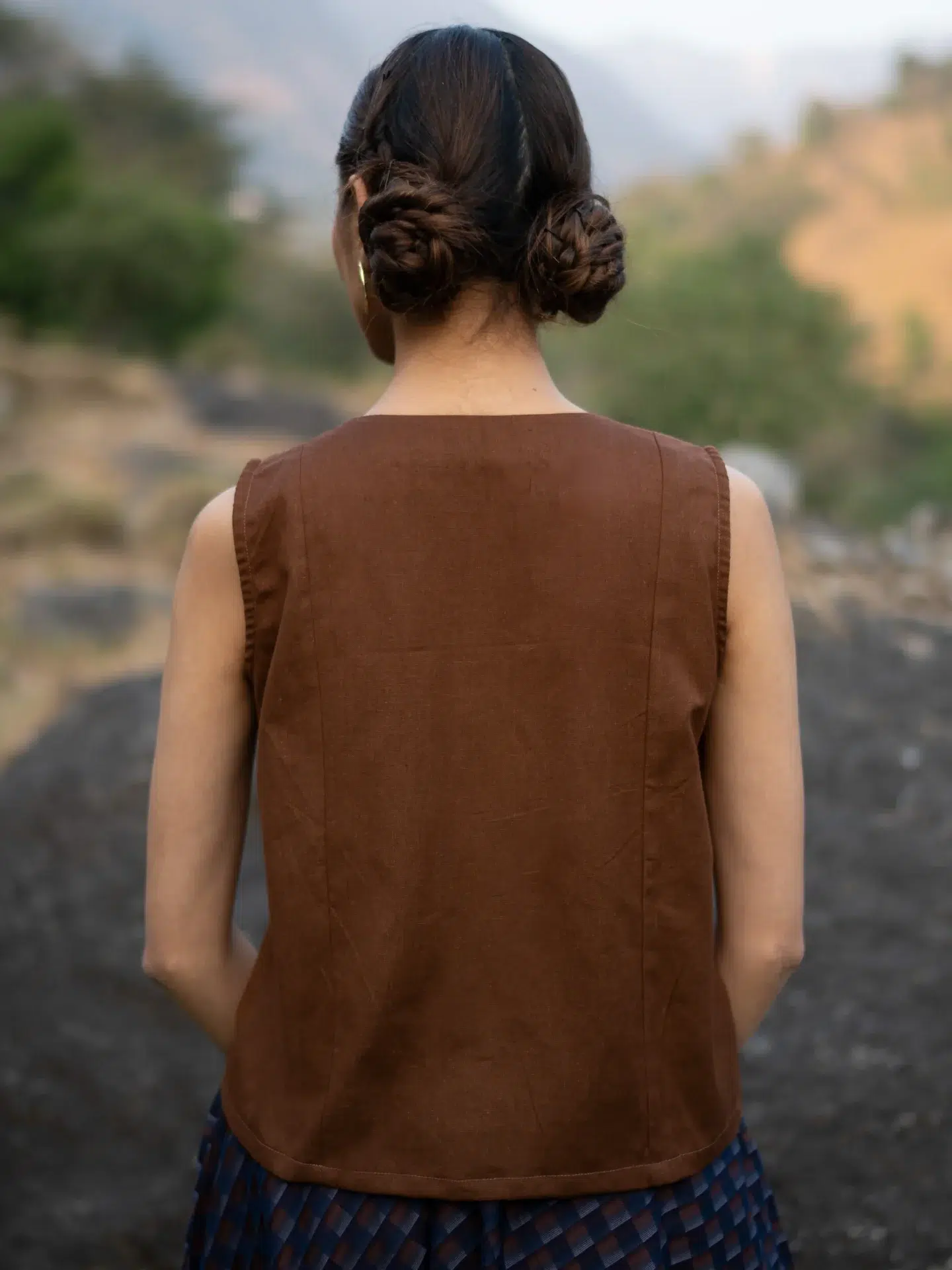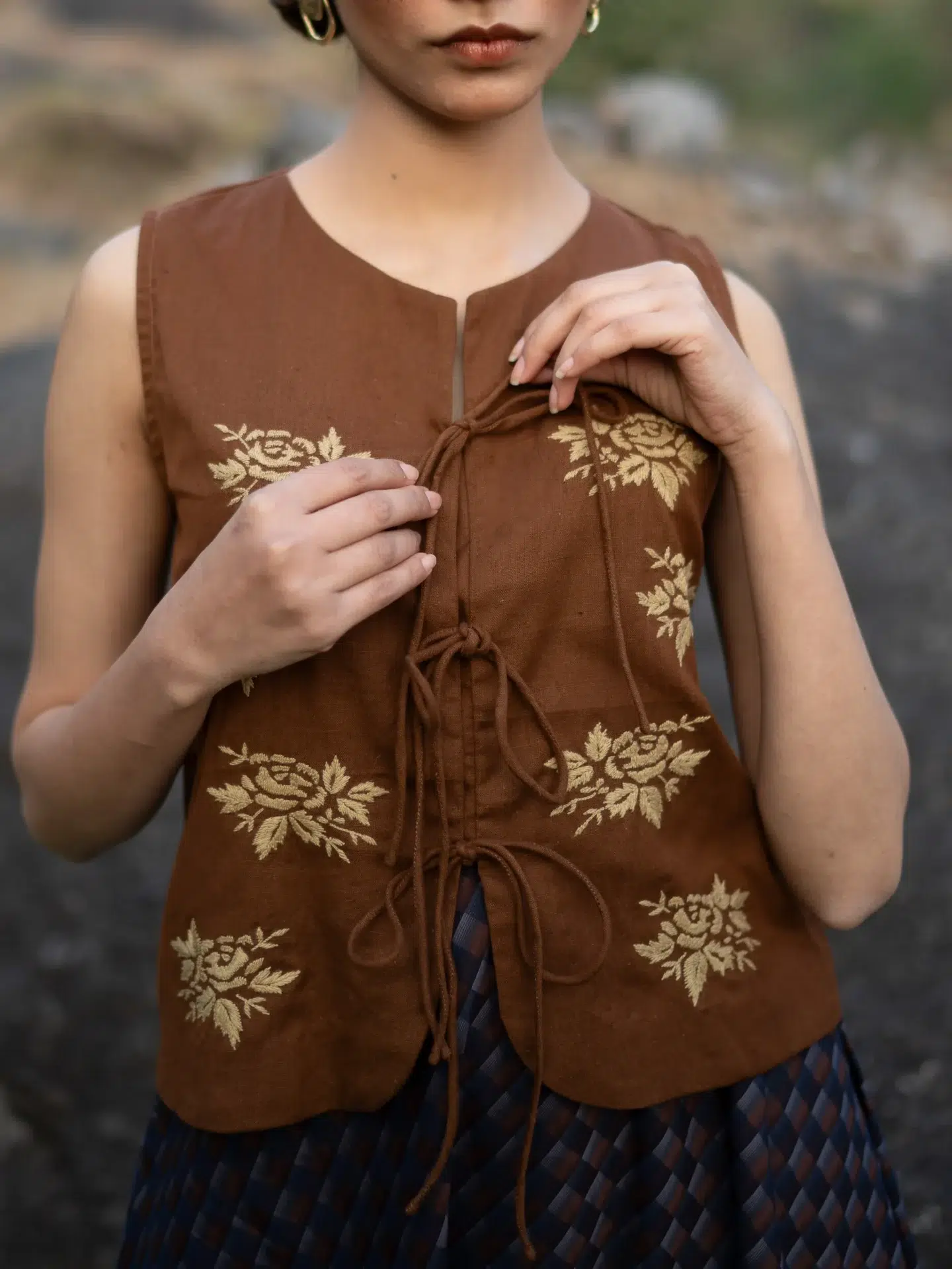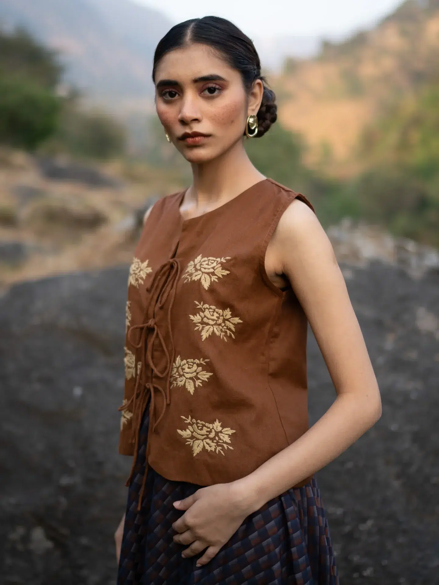 A soft cotton top featuring delicate hand-embroidered rose motifs at the front. Finished with a charming front tie-up detail, it adds a touch of effortless uniqueness to your special days.