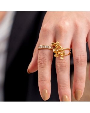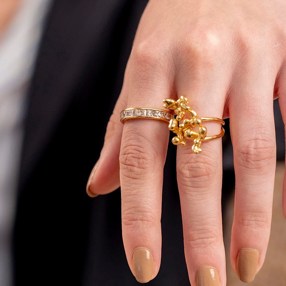 Introducing the Classic Facet Ring, a dazzling statement piece featuring princess-cut cubic zirconia stones wrapped arou