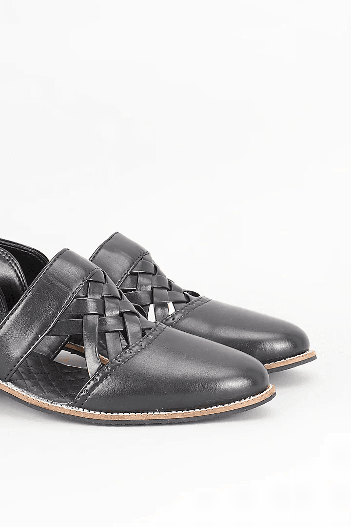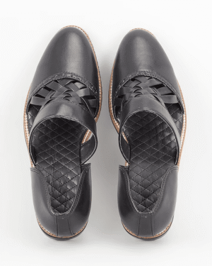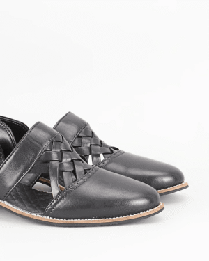 A pair of black leather based handcrafted slip on mules. It has a padded leather lining and a hard sheeted rubber sole.