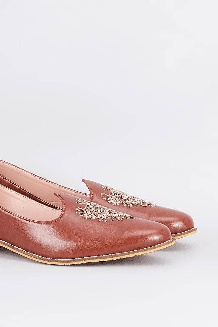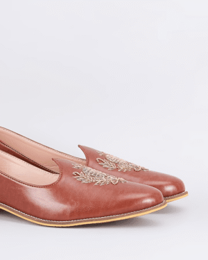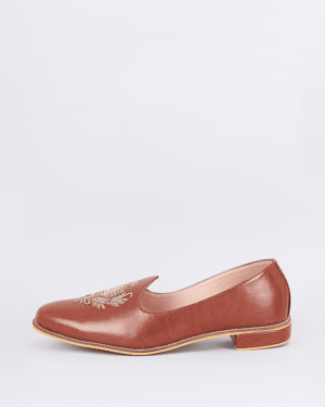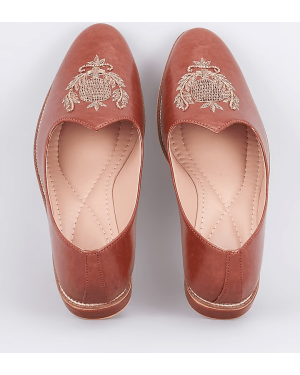 A pair of tan brown leather based slip on juttis enhanced with zari embroidered royal crest. It has a padded leather lining and a hard sheeted rubber sole.