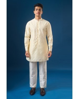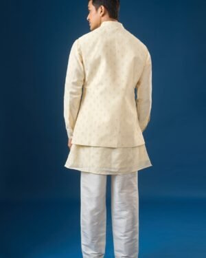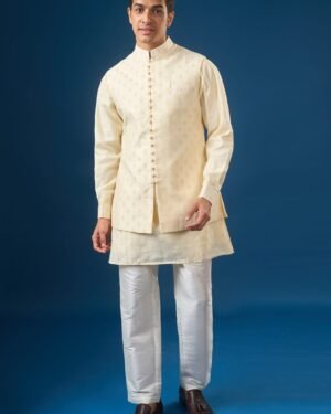 Mauve Pink brocade silk jacket enhanced with handmade fabric buttons, paired with a matching silk based kurta and and an off white dupion silk based mexican pants.
