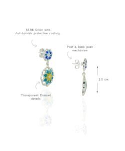 These Gul 2 charm earrings are handcrafted in 92.5% sterling silver, has an anti tarnish protective coating. These earrings has a transparent enamel details in blue, yellow colors with flower motif design. The material of these earrings are quite sturdy and has post and push back mechanism for easy wear., Plating: Silver Anti-tarnish, Metal Type: 92.5% Sterling Silver, Enamel / plating / gemstone: Transparent Enamel, Lock Mechanism: Post and push back, Measurement cm : 2.5 cm ?, Measurement inches: ? 0.98 inches, Care Instruction: Keep away from water, perfume and other liquids. Do not use any cleaning agents. Clean when storing in the provided pouches. Store them in moisture free areas and keep them away from water and liquid fragrances.