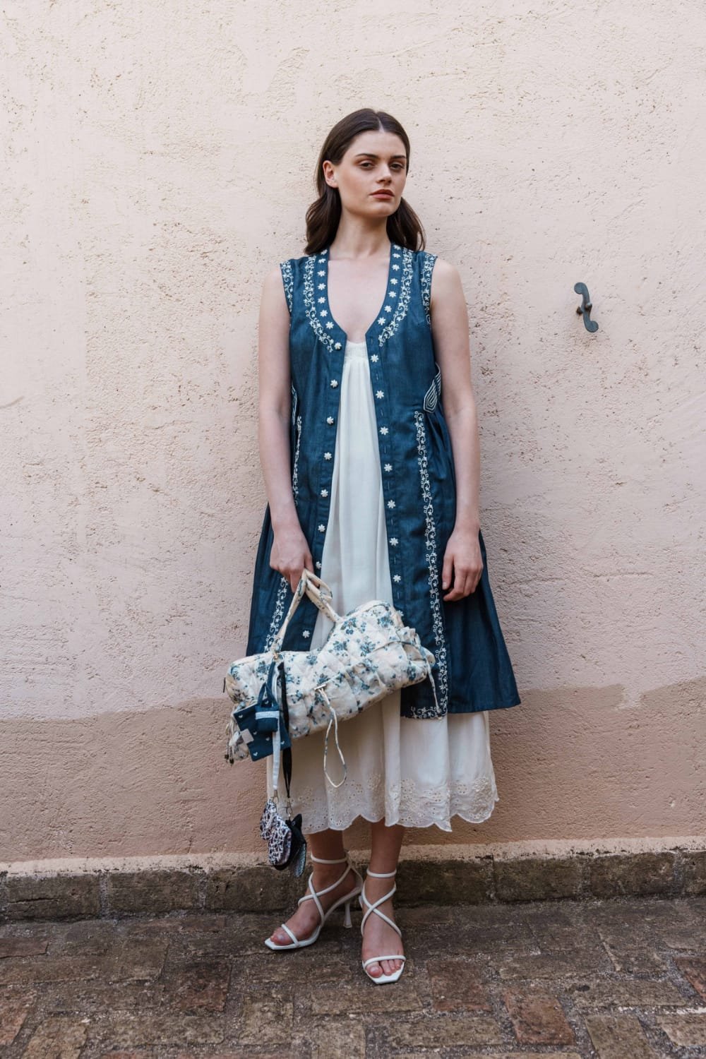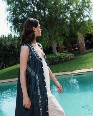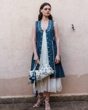 Crafted in fine fabric, this Denim front open dress with embroidery with White mul dress with lace bodice and schfflie hemline showcases Pinnacle by Shruti Sancheti?s timeless craftsmanship and feminine grace. A perfect piece for effortless day-to-evening elegance.