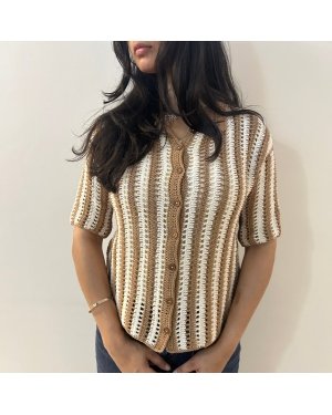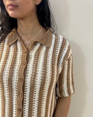 Elevate your wardrobe with the unisex Earth Stripe Crochet Shirt. Featuring a sophisticated brown and white stripe pattern, this made-to-order shirt blends style with a natural, artisanal charm.