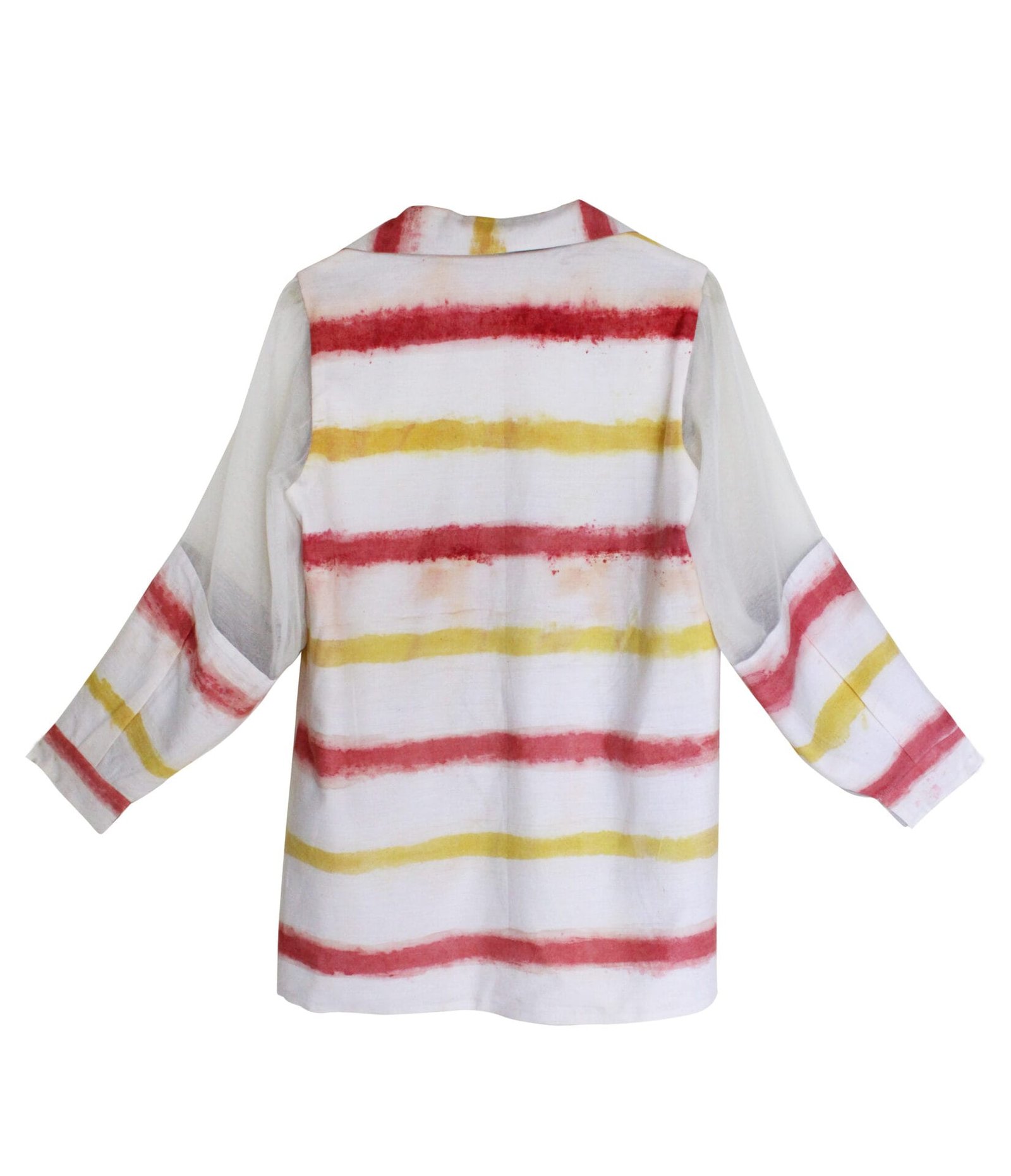 Bageeya's "Earthly Glow" Reversible Zari Chanderi and Soft Cotton Jacket embrace artistic expression and eco-conscious style with the Bageeya "Earthly Glow" Reversible Jacket. This handcrafted masterpiece seamlessly blends vibrant colors, natural elements, and exquisite craftsmanship, making it a unique addition to your wardrobe.Woven from a blend of soft handwoven cotton sourced from West Bengal and luxurious handwoven Zari Chanderi from Chanderi town, Madhya Pradesh This jacket offers both comfort and sophistication. Delicate organza fabric adorns the sleeves, adding a touch of elegance and lightness.The reversible side is dyed with organic Haldi (turmeric) and Manjistha (madder root), this jacket embodies a commitment to sustainability. These natural herbs possess unique therapeutic properties, making the jacket gentle on your skin and the planet.Experience the thrill of two stunning looks in one with this reversible design. On one side, applique work has done with a captivating butterfly motif, meticulously hand-crafted using leftover Katran fabric,
