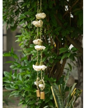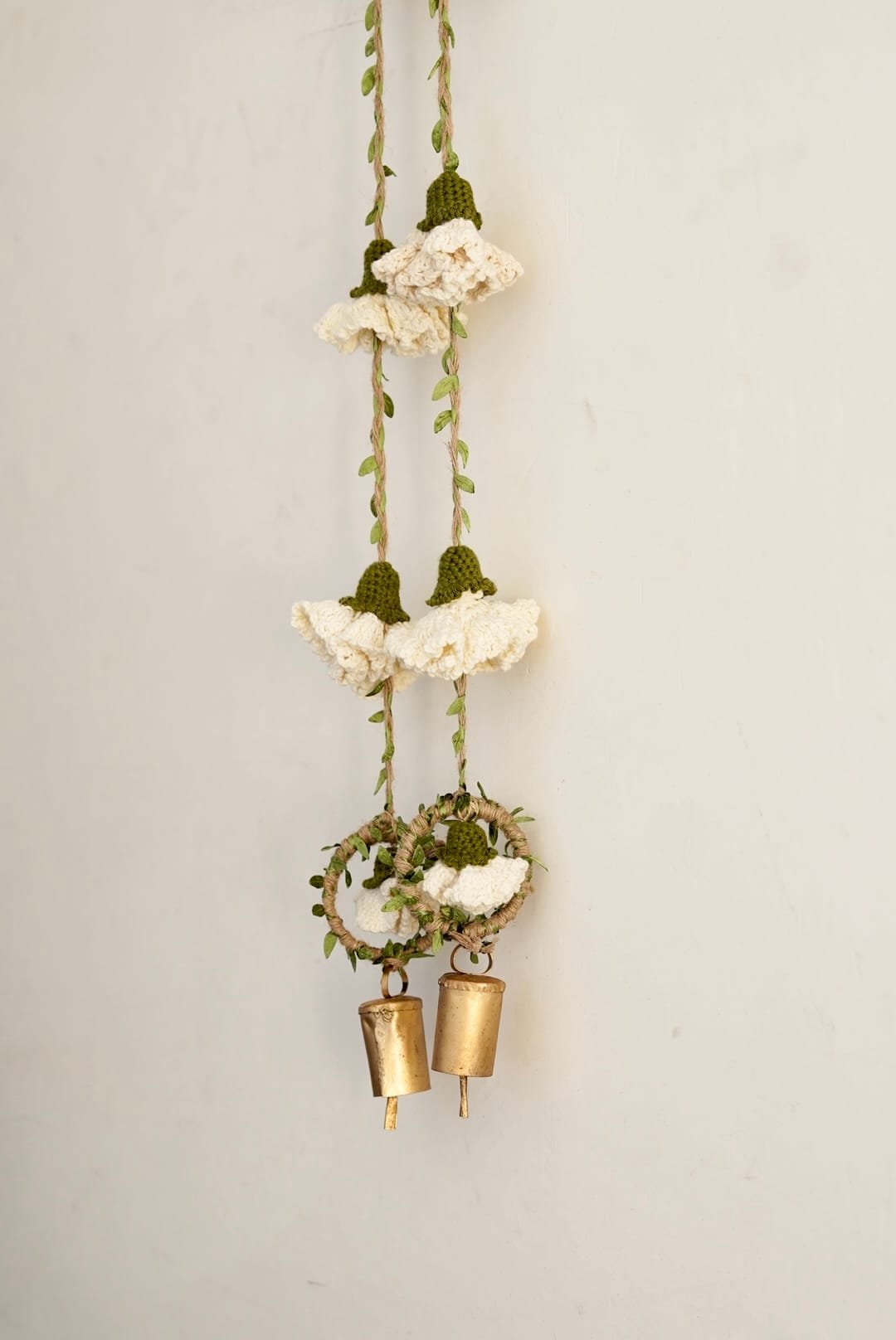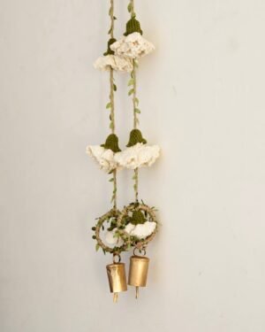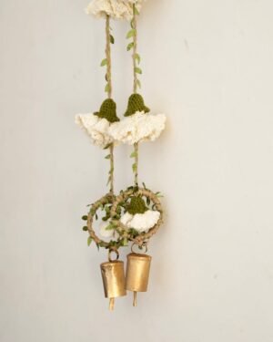 Celebrate the season of lights with handmade beauty that lasts beyond the festivities. This decor hanging brings together crochet marigold flowers on sturdy jute yarn, finished with a brass bell that adds a gentle, traditional chime. A loop at the top makes it easy to hang on doors, walls, or windows, filling your home with festive warmth and charm.
