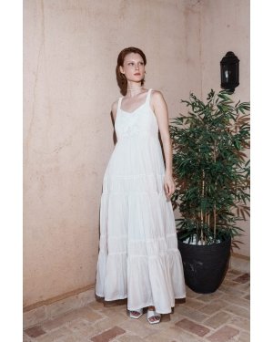 Crafted in fine fabric, this Ecru mul tiered dress with floral embroidery bodice showcases Pinnacle by Shruti Sancheti?s timeless craftsmanship and feminine grace. A perfect piece for effortless day-to-evening elegance.