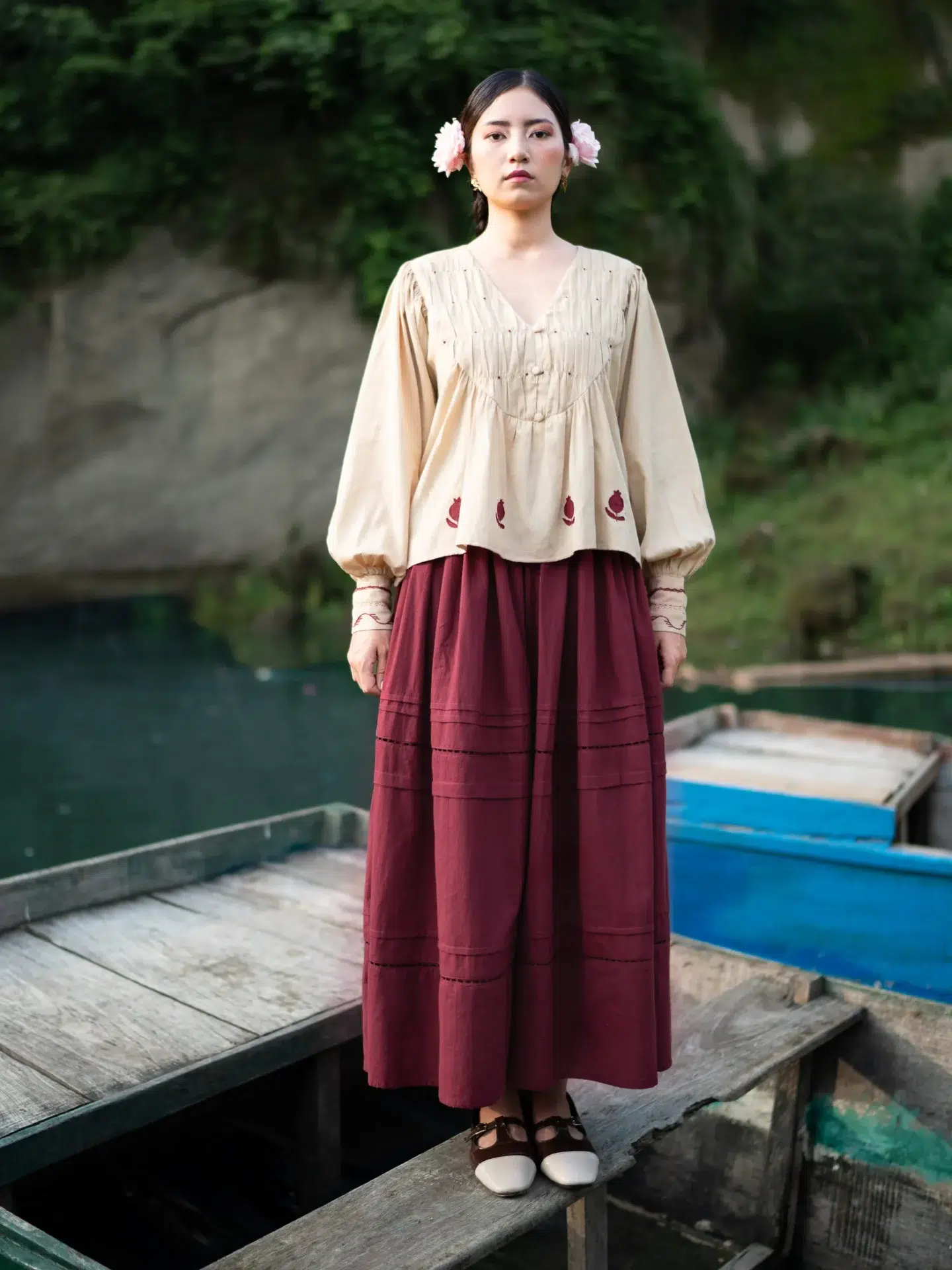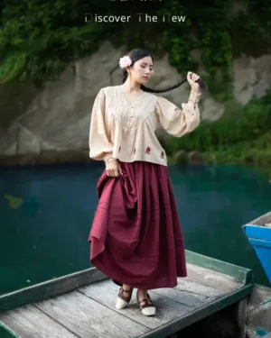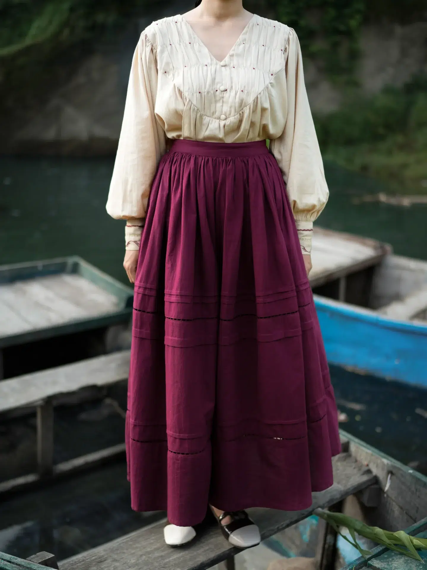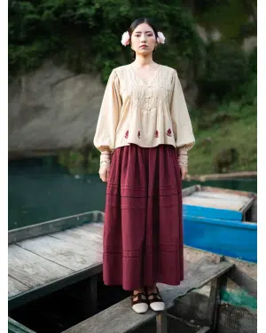 Paired with a rich maroon skirt, it creates a striking co-ord, with pleats and lace detailing all done by human hands which makes its a timeless choice for everything from casual gatherings to refined occasions