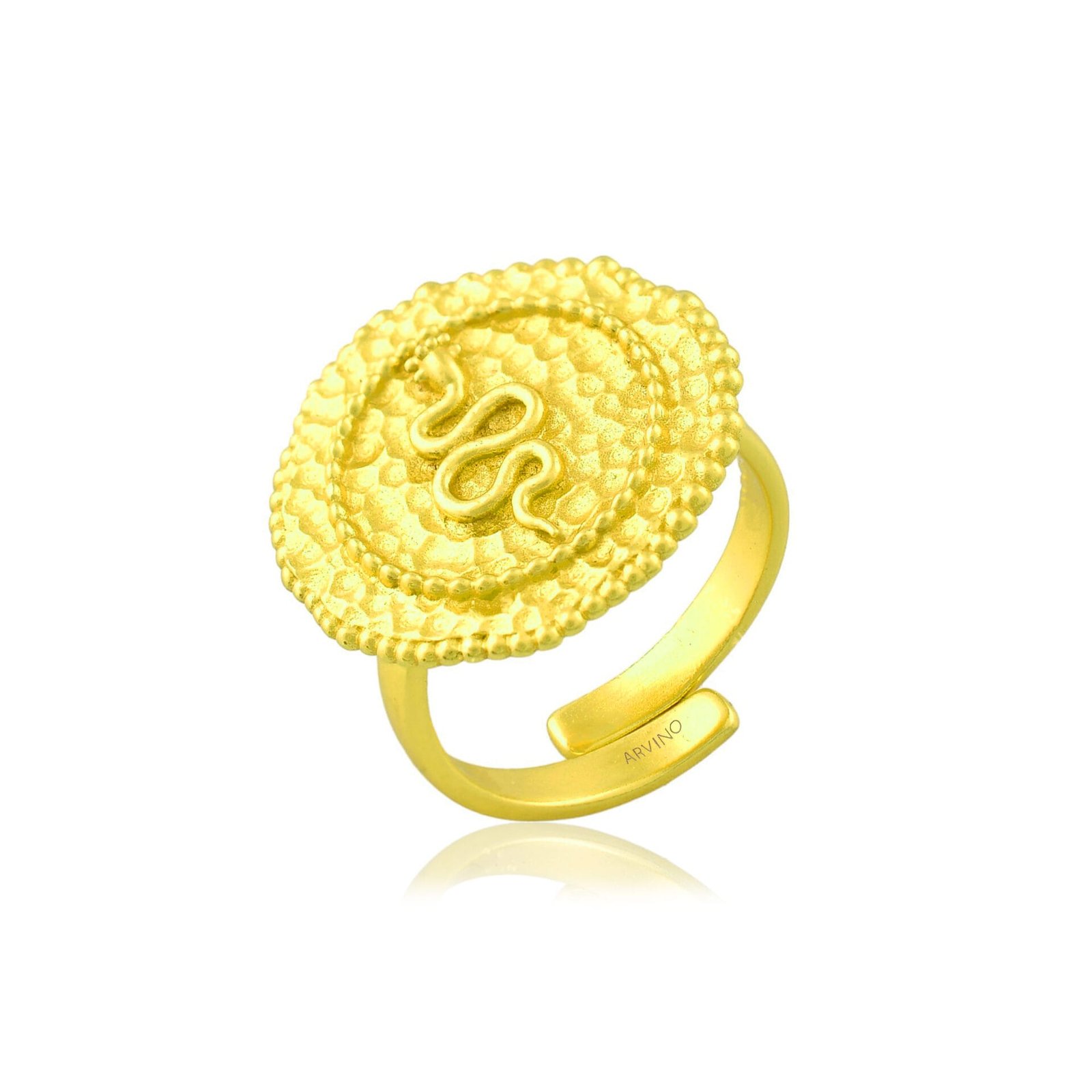 A unique Embossed Snake Coin Ring featuring a detailed snake design with a gold-textured coin shape. Crafted with 22KT r