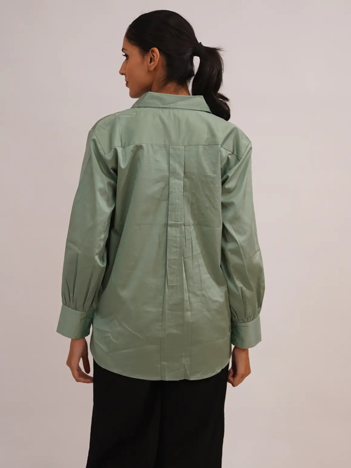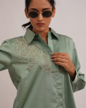 A gentle balance of elegance and allure. This serene green shirt is a celebration of refined simplicity, accentuated with delicate hand-embroidered motifs cascading gracefully over the shoulder. The subtle sheen of its satin-cotton fabric reflects understated luxury, while its relaxed silhouette ensures effortless sophistication. It’s where contemporary tailoring meets timeless femininity.