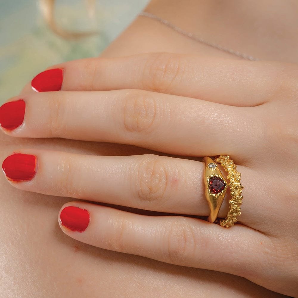 Add a pop of color and sparkle to your ensemble with our Encased Love Garnet Ring. Crafted sustainably with luxurious go