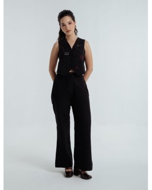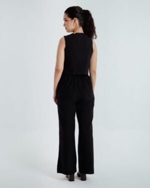 The black pants are a timeless classic, featuring a front zipper, practical side pockets, and a clean, tailored finish. Made from handspun organic cotton, they transition seamlessly from day to night and are especially striking when styled with the waistcoat.Effortless, refined, and rooted in tradition, Fayra is a celebration of heritage, craftsmanship and understated sophistication.Pants length: 40 inchesModel height: 5’7” (wearing size S)