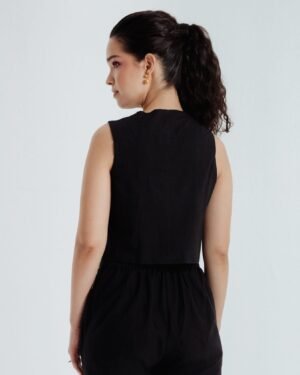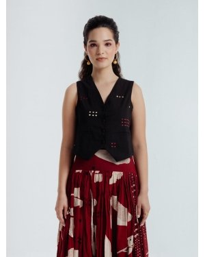 This bohemian black waistcoat showcases delicate embroidery in contrasting red and beige hues that beautifully can complement skirt or pant .Crafted from fine handwoven organic cotton spun in Bengal, it features a lined interior for a crisp, structured fit.Versatile and elegant, this waistcoat pairs effortlessly and can be styled with various pieces from your wardrobe.Waistcoat length 17 inchesModel height is 5"7 wearing S