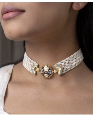 A tribute to timeless elegance, the Feroza Meher Choker is a handcrafted masterpiece in 925 sterling silver with luxurious thick gold plating. Multiple strands of woven pearl jaali mesh drape gracefully around the neck, crafted to be worn like a memory. The detailed enamel artistry and vintage-inspired silhouette offer a perfect harmony of tradition and sophistication?making it a stunning choice for both festive and formal occasions., Plating: Gold Plated, Metal Type: 92.5% Sterling Silver, Enamel / plating / gemstone: Transparent Enamel, Lock Mechanism: J-Lock , Measurement cm : Length - 24 cm / Width - 2.54 cm , Measurement inches: Length - 9.44 inch / Width - 1 inch, Care Instruction: Keep away from water, perfume and other liquids. Do not use any cleaning agents. Clean when storing in the provided pouches. Store them in moisture free areas and keep them away from water and liquid fragrances.