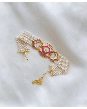 This elegant bracelet is a handcrafted piece featuring a central floral enamel motif in vibrant pink, ivory, and gold tones. Made in 925 silver with thick gold plating, it is adorned with multiple strands of delicate pearls, creating a rich, timeless look. The detailed enamel work and classic design make it a perfect blend of tradition and sophistication., Plating: Gold Plated, Metal Type: 92.5% Sterling Silver, Enamel / plating / gemstone: Transparent Enamel, Lock Mechanism: J-Lock , Measurement cm : Width 2 cm / Length - 13.2 cm / Extention - 5 cm , Measurement inches: Width 0.78 inch / Length - 5.19 inch / Extention - 1.9 inch, Care Instruction: Keep away from water, perfume and other liquids. Do not use any cleaning agents. Clean when storing in the provided pouches. Store them in moisture free areas and keep them away from water and liquid fragrances.