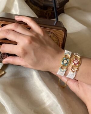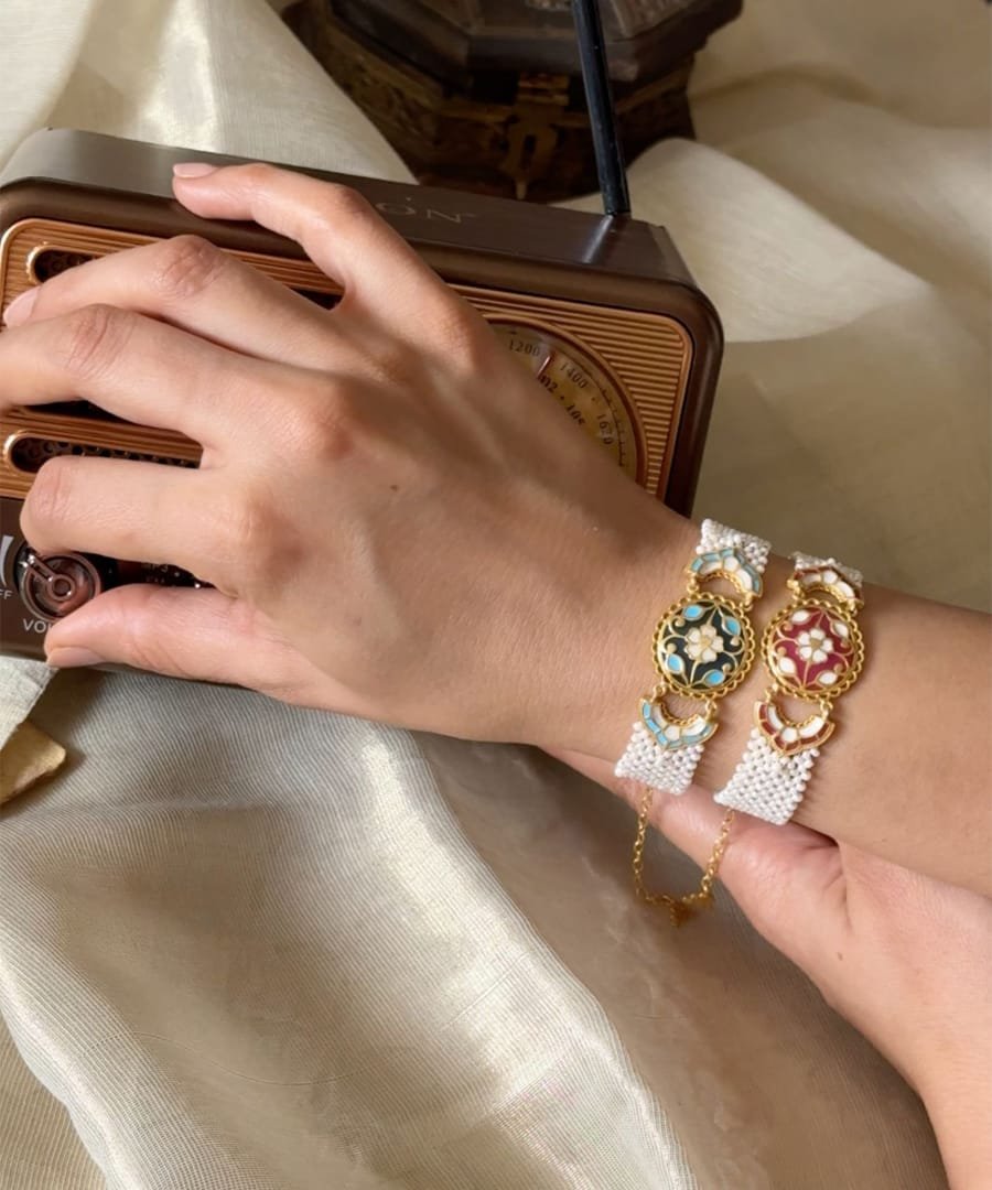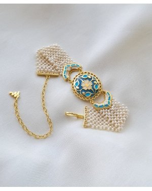 This elegant bracelet is a handcrafted piece featuring a central floral enamel motif in vibrant blue, ivory, and gold tones. Made in 925 silver with thick gold plating, it is adorned with multiple strands of delicate pearls, creating a rich, timeless look. The detailed enamel work and classic design make it a perfect blend of tradition and sophistication., Plating: Gold Plated, Metal Type: 92.5% Sterling Silver, Enamel / plating / gemstone: Transparent Enamel, Lock Mechanism: J-Lock , Measurement cm : Width 2 cm / Length - 13.2 cm / Extention - 5 cm , Measurement inches: Width 0.78 inch / Length - 5.19 inch / Extention - 1.9 inch, Care Instruction: Keep away from water, perfume and other liquids. Do not use any cleaning agents. Clean when storing in the provided pouches. Store them in moisture free areas and keep them away from water and liquid fragrances.