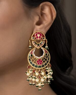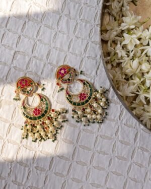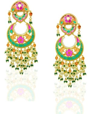 More than just jewelry, these Chandbali earrings are a memory to wear. Handcrafted from 925 sterling silver with a luxurious gold plating, they feature intricate enamel work in soft pink, green & orange.