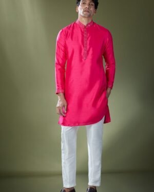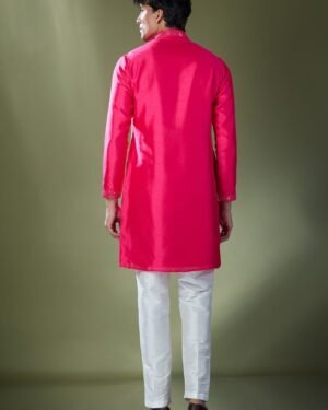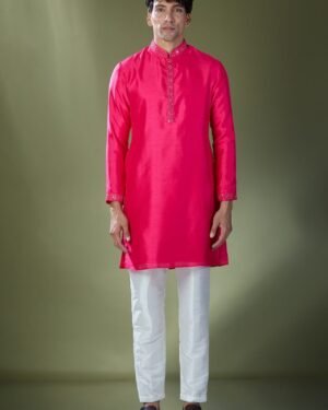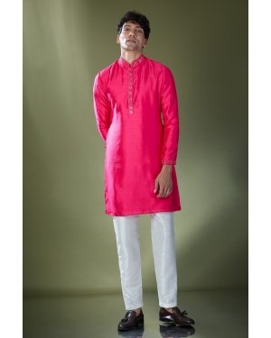 Fuscia slub silk based kurta enhanced with mirror embroidery paired with an off white dupion silk based pants.