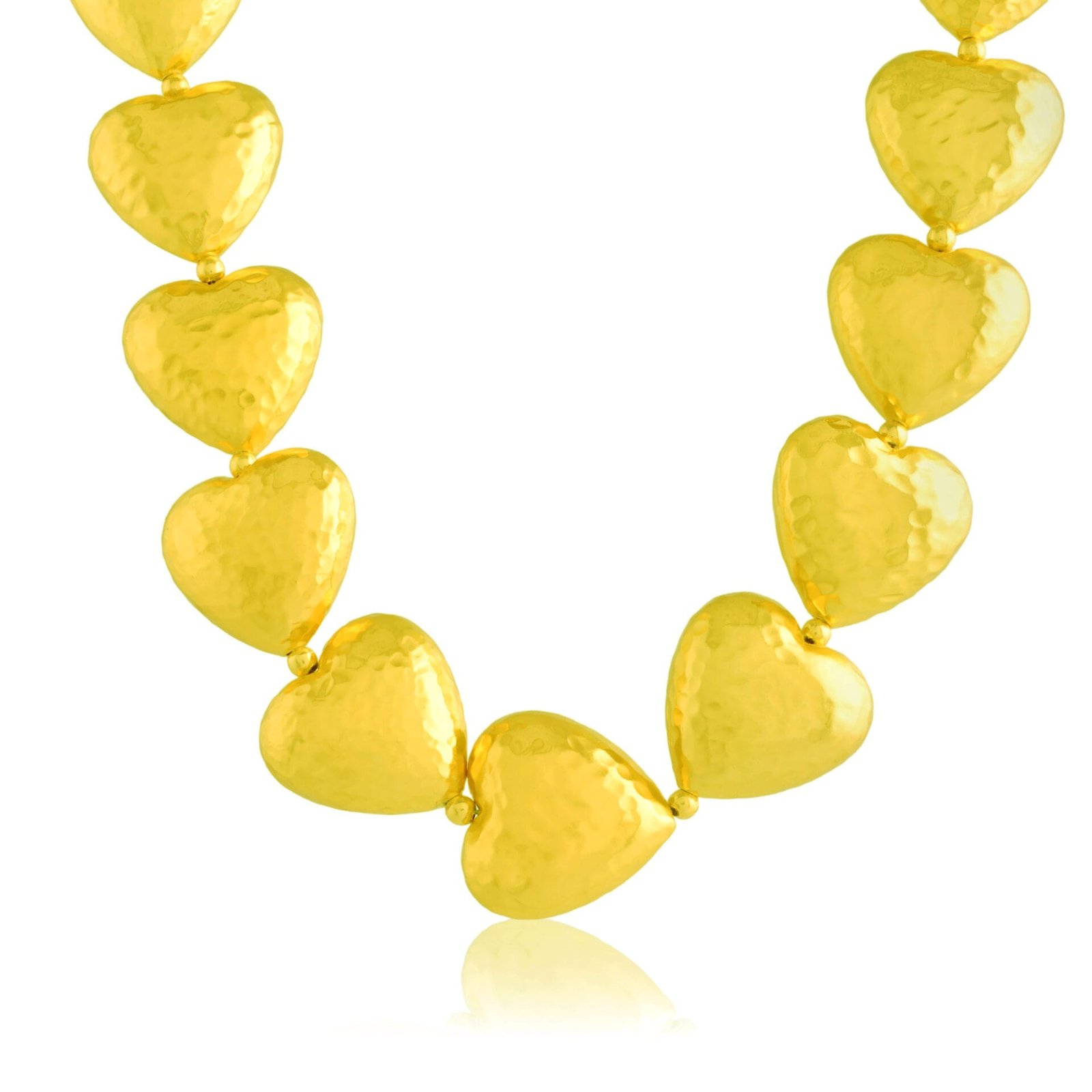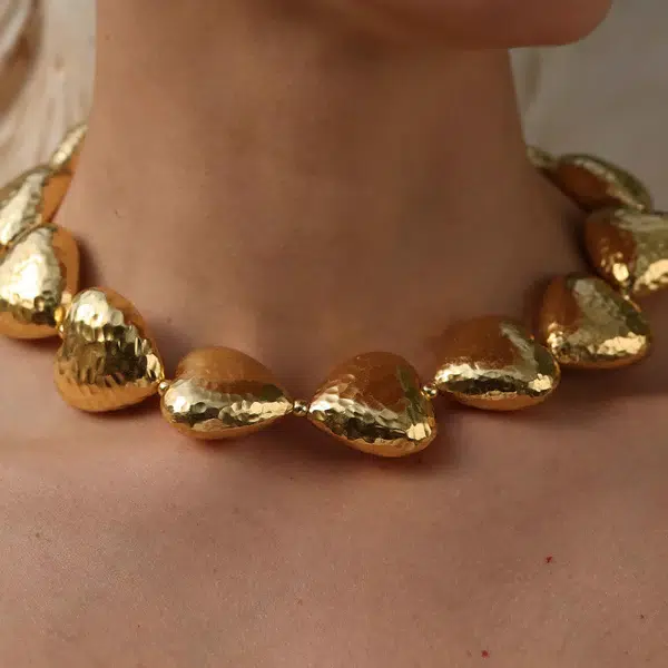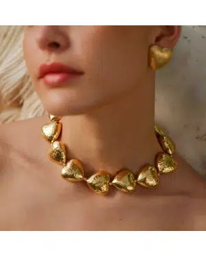 Add a touch of romance and modern elegance to your jewelry collection with the Gilded Concave Graduating Hearts Necklace, designed to reflect warmth, love, and contemporary luxury.Featuring graduating concave heart motifs, this necklace is finished with 22KT real gold plating over a premium brass alloy base, giving it a rich glow and smooth reflective surface. The sculpted heart design creates a striking yet graceful statement that flatters both ethnic and western outfits.Perfect for party wear, festive celebrations, romantic evenings, weddings, and special occasions, this necklace pairs beautifully with dresses, sarees, gowns, and Indo-western ensembles.✨ Key Highlights:Graduating concave heart design with radiant finish22KT real gold plating for premium shineDurable, skin-friendly brass alloyLightweight yet statement-making silhouetteLong-lasting brilliance with proper careAn ideal choice for women who love romantic statement jewelry with a refined, modern touch.
